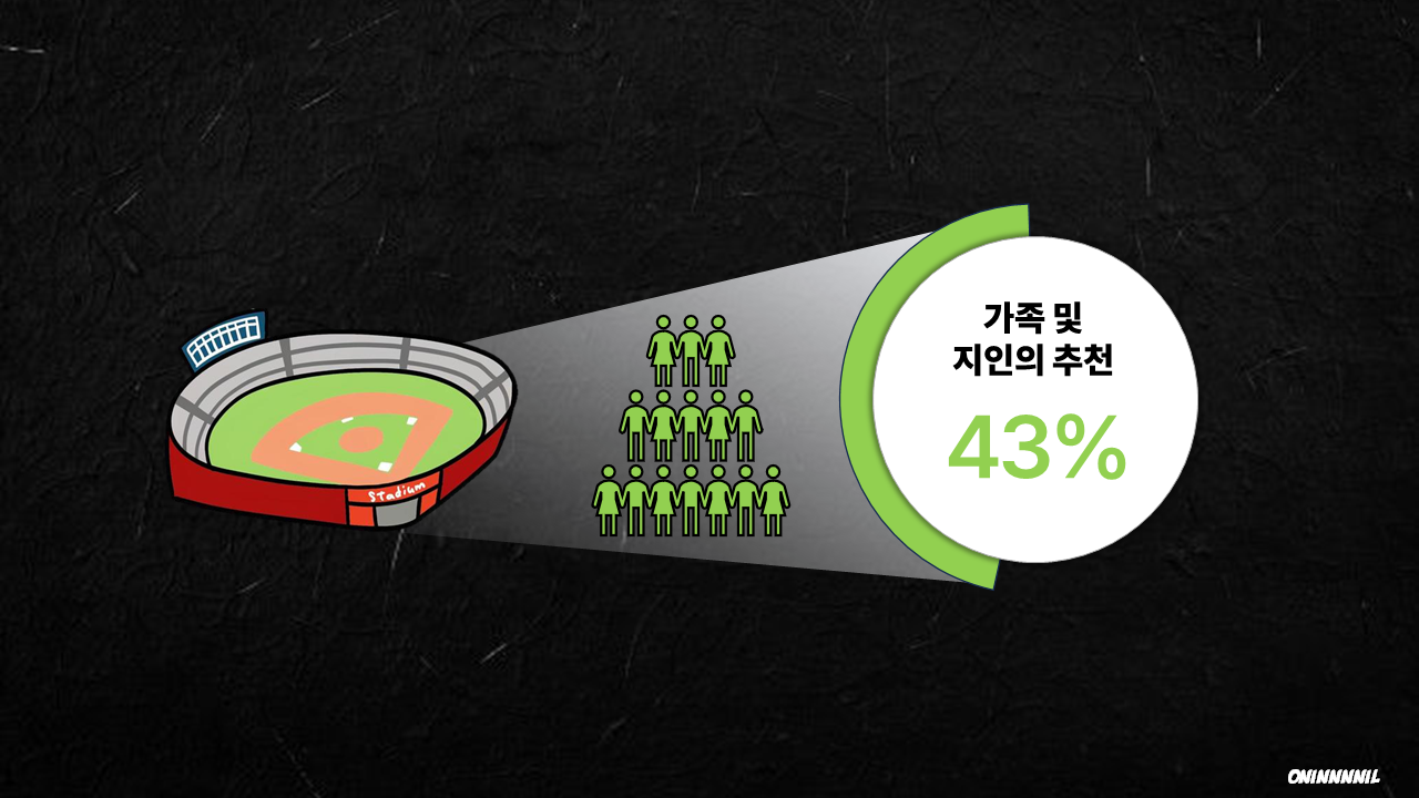 2022 프로스포츠 관람객 성향 조사에 따르면, 프로스포츠 팬이 아닌 일반 국민의 경우 전체 응답자 중 43.3%에 달하는 응답자가 가족 및 지인의 추천으로 야구장 경기 관람을 결정하는 계기가 된다고 한다. 자료에서 볼 수 있듯이 야구장 관중의 유입은 주로 가족 및 지인의 추천으로 이루어지는 경우가 많다. 지인의 영향이야말로 야구팬 확장에 큰 역할을 했던것이다.