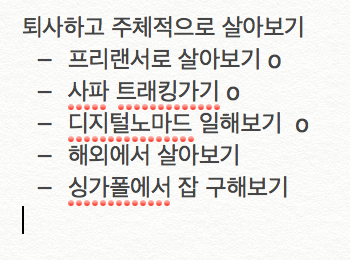 '퇴사하고 주체적으로 살아보기'라는 소박한 버킷리스트가 적혀있었는데 그중 '해외에서 살아보기'와 '싱가포르에서 잡 구해보기' 제외하곤 2/3는 해결한 것이 아닌가?