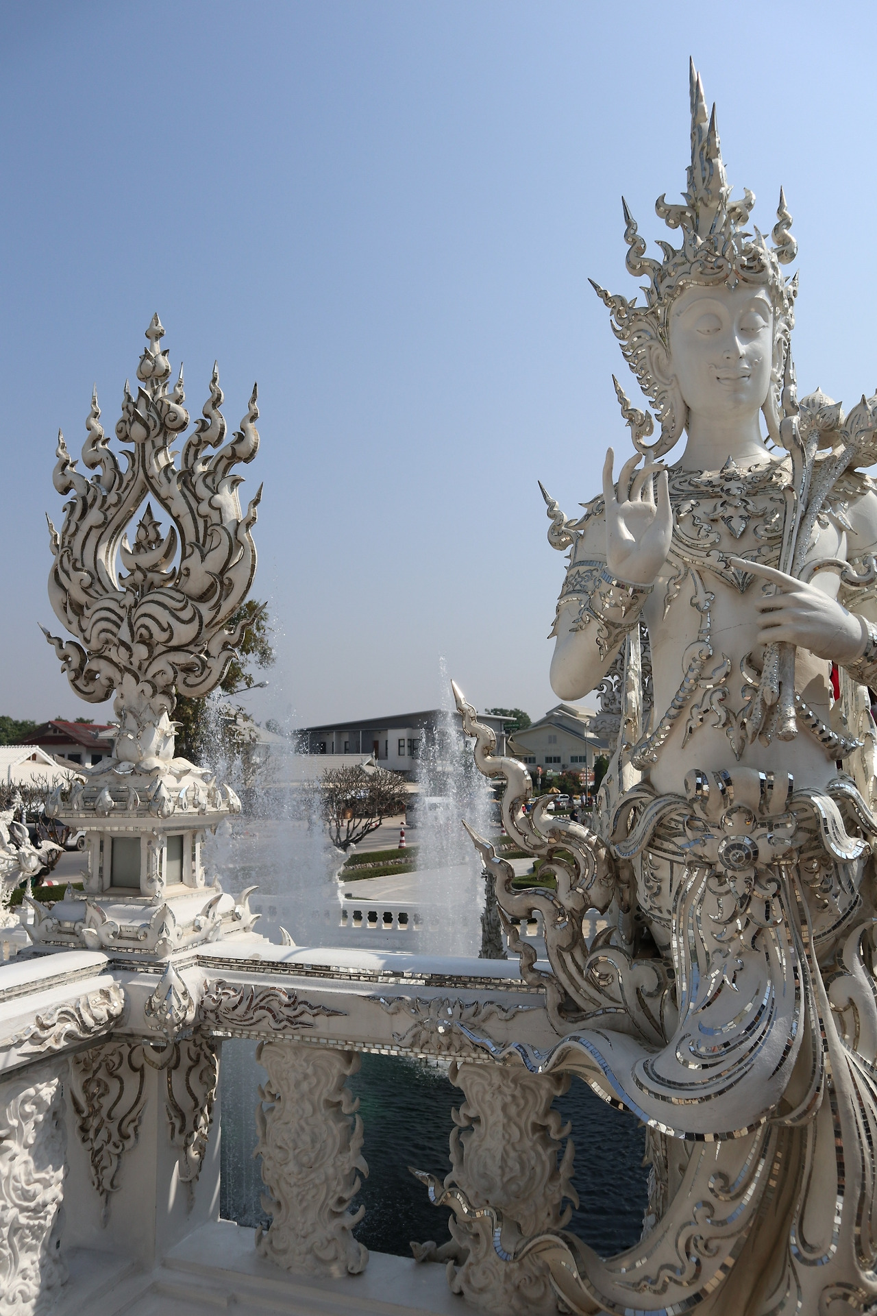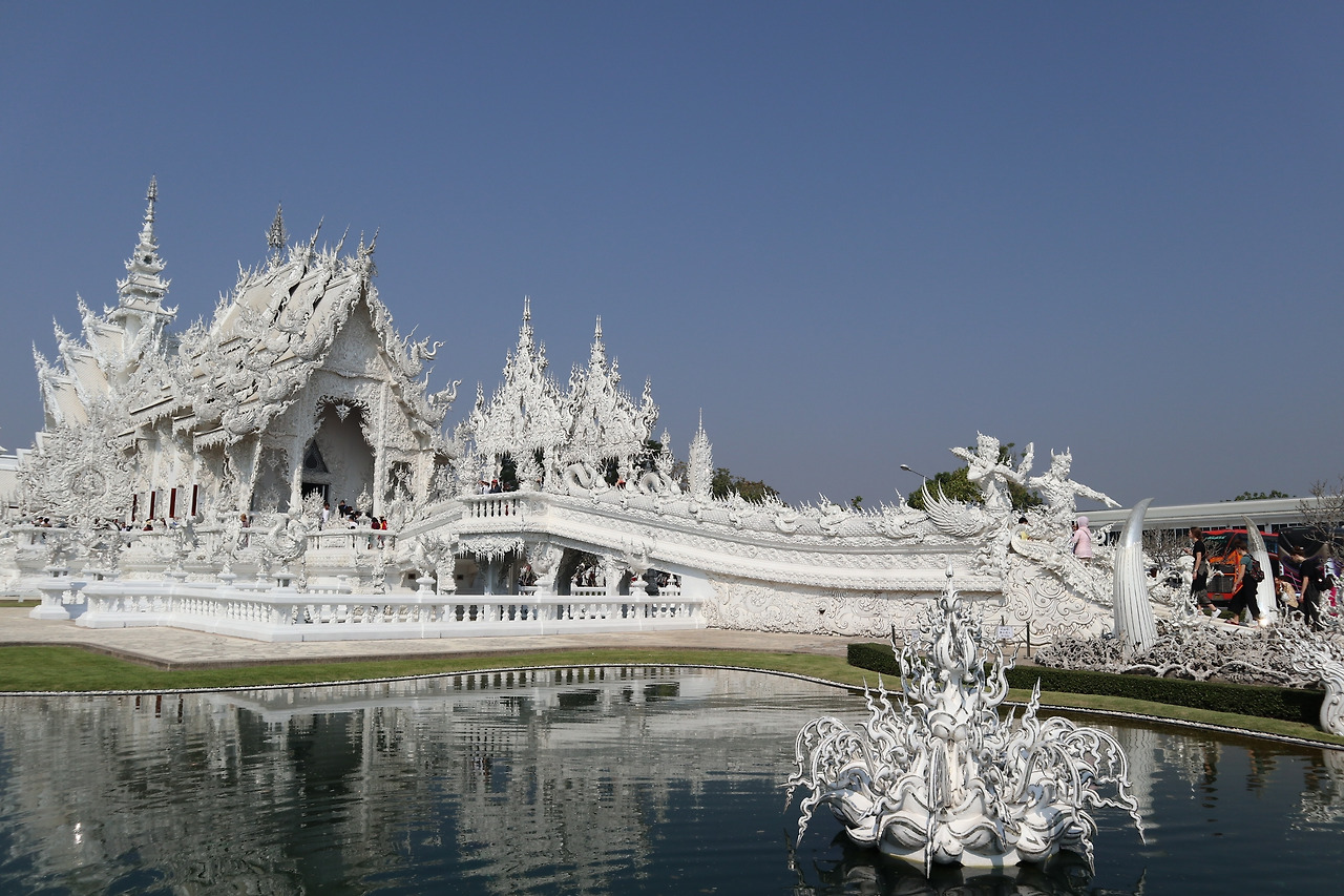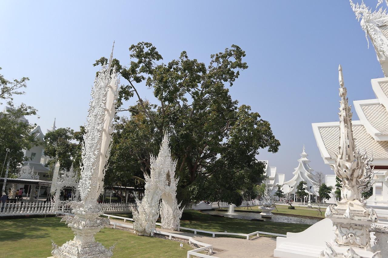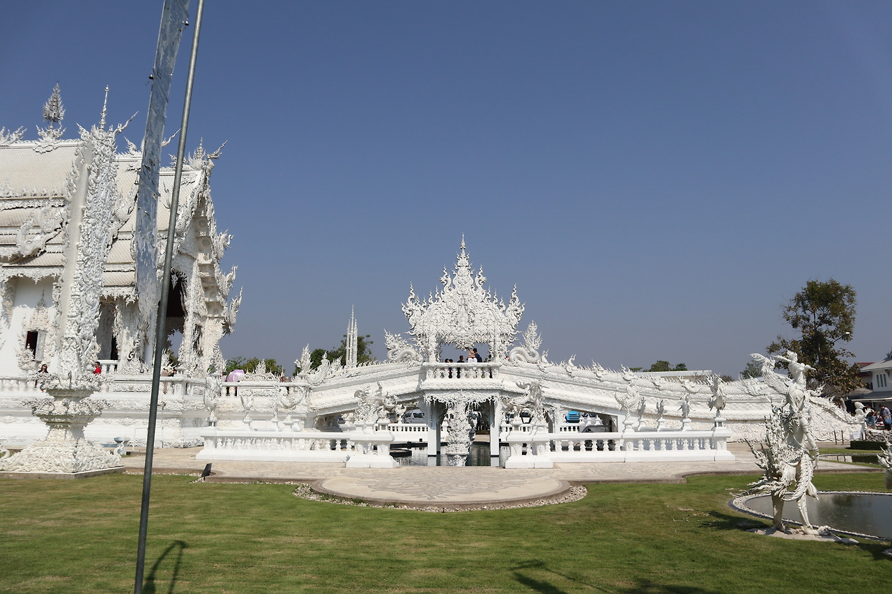 잠시 휴식을 취하고 한창 졸다 보니 치앙라이 데이투어의 첫 목적지인 Wat Rong Khun에 도착했다. 사원 전체가 흰색이라 화이트 템플이라고 불리는 왓 롱쿤은 햇살을 받으니 그 아름다움이 배가 되었다. 왓 롱쿤은 치앙라이 출신 예술가 찰름차이 코싯피팟이 설계한 사원으로 흰색으로 부처님의 순수를 표현하고 있다. 치앙라이의 랜드마크 중 하나답게 관광객이 정말 많았다. 부처님의 윤회사상을 뜻한다는 둥근 다리를 줄 서서 건너야 할 정도로 사람이 많았는데 가이드 말이 이 정도면 보통이라고 해서 좀 놀랐다. 이 사원은 관광객뿐 아니라 현지인들에게도 인기가 많은 곳이라 언제나 사람이 많은 편이라고 한다.