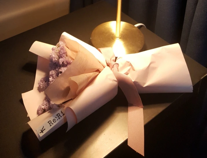 후배의 모습이 보이지 않아 식당에 먼저 자리 잡고 앉아 있는데 5분 뒤에 후배가 작은 꽃을 들고 들어왔다.