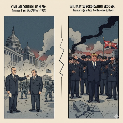 이런 사례는 과거 군 정치화의 역사와 비교할 때 그 위험성이 더욱 선명해진다. 남북전쟁 이후 재건 시기에 연방군이 남부 지역에서 과도하게 민간 법 집행에 개입했던 경험은 군의 정치적 중립이 훼손될 때 어떤 권력 남용이 벌어질 수 있는지를 보여준다. 또한, 냉전기 라틴아메리카에서 군이 정치적 정당성을 명분 삼아 권력을 장악했을 때, 민주주의가 얼마나 쉽게 군사정권으로 대체되는지 국제적 사례는 충분히 입증해왔다. 트럼프의 퀀티코 회의는 바로 이런 역사적 경고를 미국 내부에서 재현하려는 듯한 모습이다.