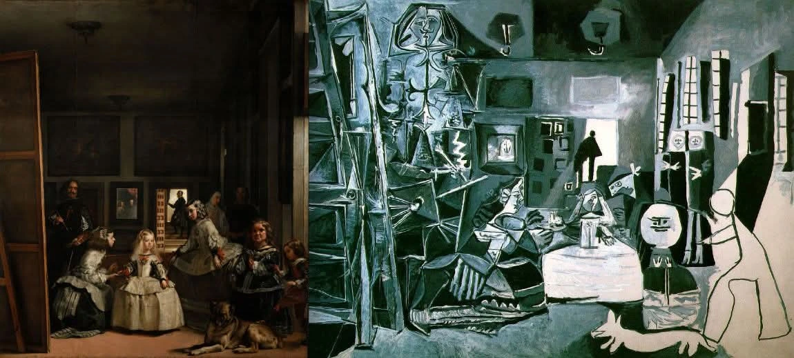 그러한 고민의 정점이자 가장 정교한 실험 중 하나가 바로 1957년의 <라스 메니나스> 연작이다. 벨라스케스의 17세기 걸작 <시녀들>을 바탕으로 피카소는 58점에 이르는 재해석 작업을 감행한다. 그는 단지 인물의 위치를 바꾸고, 색과 선을 바꾸는 것에 머물지 않았다. 시선의 구조 자체를 해체하고, 회화의 극적 구성을 자신만의 방식으로 재조립했다.