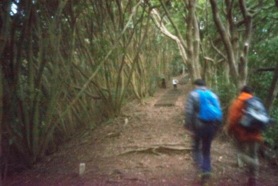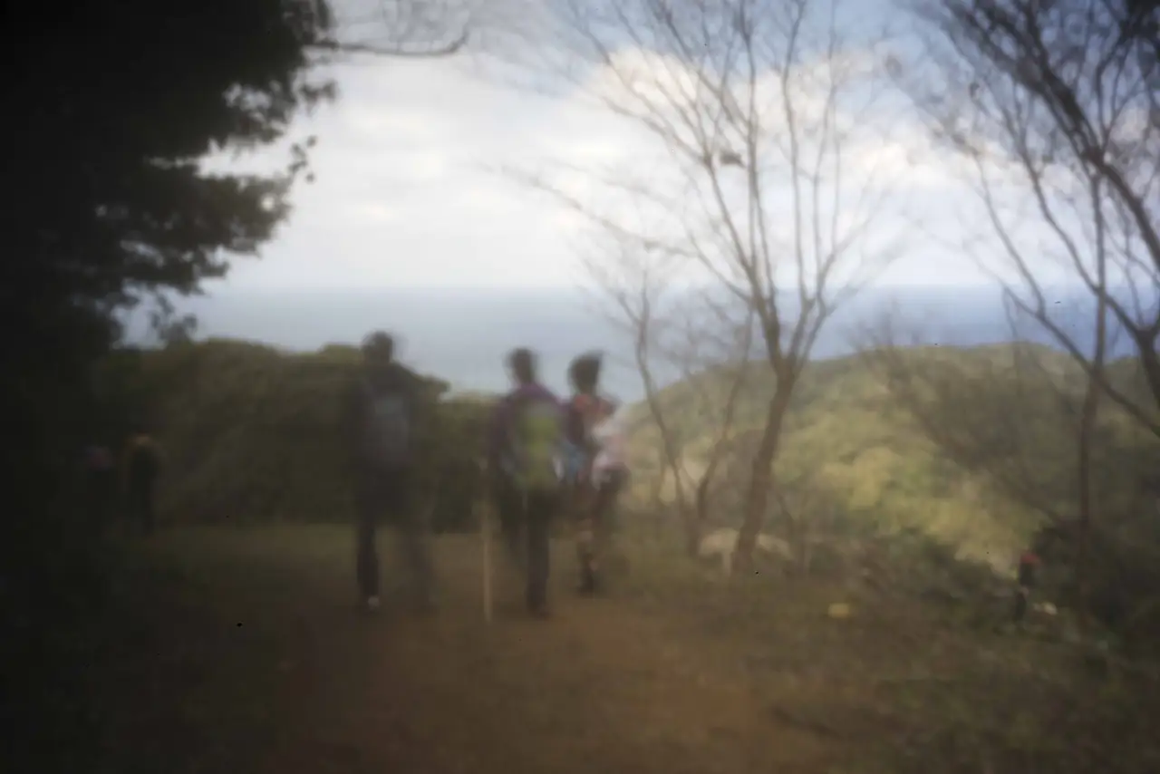 오시마 여객터미널이 무나카타-오시마 코스의 출발점입니다. 일행들이 모두 모여 단체 사진을 찍고 가볍게 발걸음을 옮깁니다. 더 젊거나 나이 드신 분들도 있지만 저를 포함한 대부분이 50~60대 분들입니다. 걷는 여행에 좋은 나이 때가 있는 것은 아니지만 비슷한 또래와 함께하니 편안한 느낌을 받습니다. 소풍 가는 기분으로 규슈 올레 표시인 파란색과 다홍색 리본 표시를 따라 걷습니다. 미타케 산을 오르고 바다를 바라보며 들길을 걷습니다. 마을에서는 꽃이 핀 벚나무들이 많았는데 산길에서 만난 벚나무는 아직 가지만 있습니다.