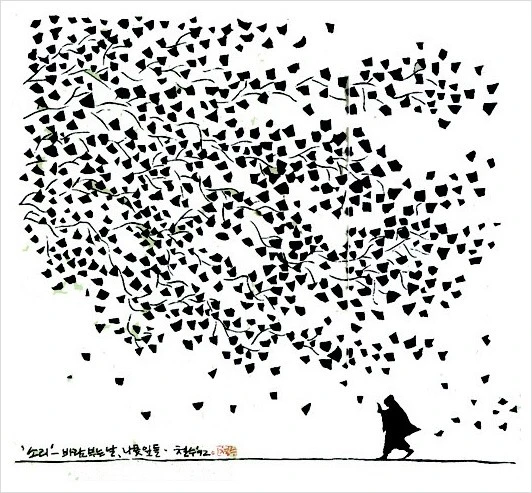 최근 잡념을 없애는 더 강력한 무기를 찾았다. 그것은 바로 그림이다. 지난 여름날 산길을 걷다가 바람이 불어오는데 그렇게 기분이 좋을 수 없었다. 수많은 나뭇잎이 살랑거리며 움직였고, 나뭇잎들이 서로 부딪히면서 내는 바스락 소리가 마치 풍경 소리처럼 들렸다. 감정의 찰나를 표현할 길이 없었는데 이철수 님의 <바람 부는 날> 작품을 접하고 이거구나 싶었다. 셀 수 없는 나뭇잎이 나부끼는 판화가 수많은 감정을 대변했다. 그 순간 붓을 들고 싶은 욕구가 솟구쳤다.