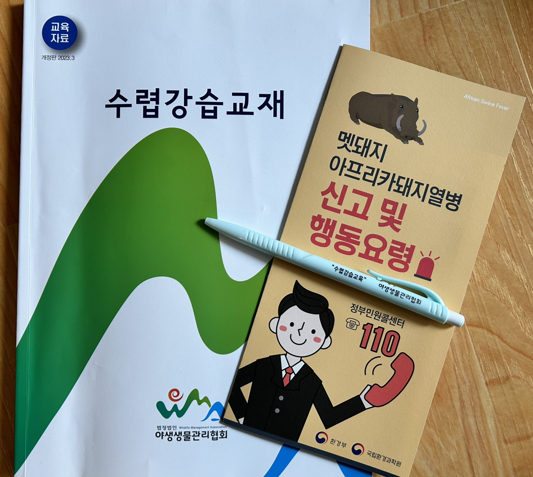 신규 합격자들과 갱신자분들이 전국 각지에서 모였습니다. 본인확인을 하고 박수를 받으면서 입장했습니다. <멧돼지 아프리카돼지열병> 팸플릿도 꼼꼼히 챙겼습니다. 중장년 남성분들이 대다수였고 부부동반으로 오신 분들이 많으셨습니다. 잠시 현타가 왔지만 수렵면허를 따러 서울에서 평일에 내려갔기에 정신을 차렸습니다. 멧돼지가 농가나 주택가에 갑자기 나타난다면 어떻게 해야 할까요? 시청각에만 의존하는 조류와 달리 멧돼지는 시력이 나빠 절대적으로 후각에 의존하기에 담배를 피우거나 향수를 뿌렸다면 멧돼지를 자극할 수 있으니 몸가짐을 사려야 합니다. 반려동물이 우는 소리가 멧돼지의 청각에 잡혀 잡아먹힐 수 있으니 풀어놓지 말고 단속해야 합니다. 다행히 멧돼지가 사람을 먼저 공격하는 일은 드물다니, 섣불리 도망치거나 총소리를 내며 무모하게 공격한다면 매우 위험합니다.