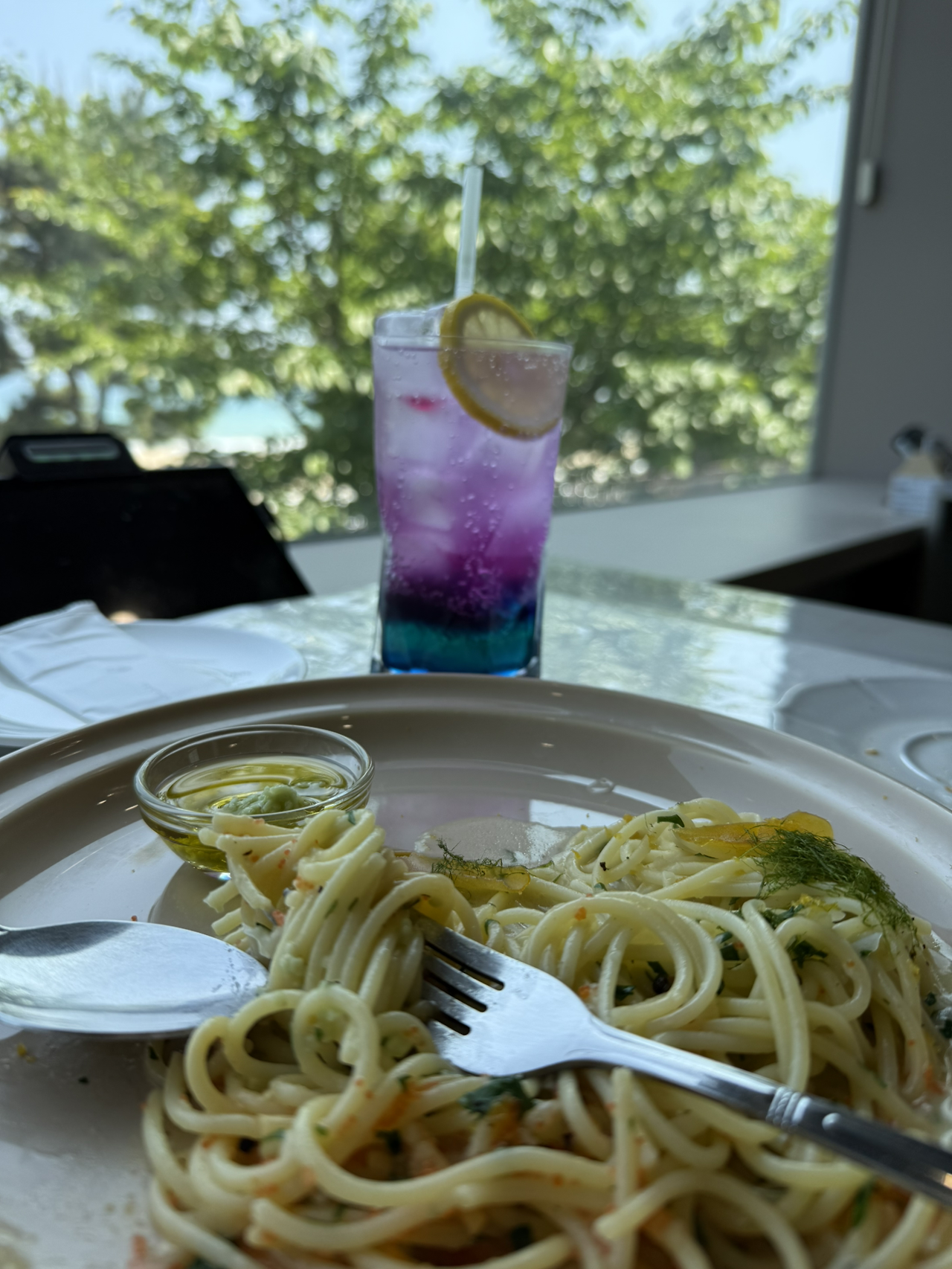 맑은 날에는 다릿돌전망대나 해월전망대에 자유롭게 타고 내릴 수 있고, 우천 시 운치가 있지만 갈 수 있는 지역이 제한됩니다. 해운대구 워케이션 업무공간으로 송정과 청사포 중 선택을 할 수 있는데 숙소 근처이자 식사가 편한 송정 홀리라운지로 업무공간을 예약했습니다. 워케이션에서 숙소와 관광바우처가 제공되기에 업무공간 체크인 확인이 필수입니다. 김해공항 국내선으로 가뿐하게 도착해 업무공간으로 달리니 차로 40분 정도 소요됩니다. 아침이라 교통도 원활하고 날씨도 좋아 해운대구는 휴식하기에도 일하기도 좋았습니다. 출장을 가면 맛집서치는 필수인데, 마침 업무공간 건물이 소문난 블루리본과 레드리본 맛집이라서 먹고 싶은 메뉴 (어란파스타, 들깨고사리파스타, 오로라에이드)를 미리 정해서 갔습니다. 저는 J라서 디테일이 완벽한 출장 계획을 짜야 안심합니다. 와인 1병 콜키지가 무료이니 단체 워크숍이라면 미리 챙겨가심 좋겠습니다.