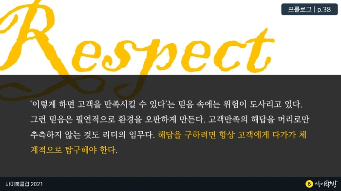 ‘이렇게 하면 고객을 만족시킬 수 있다’는 믿음 속에는 위험이 도사리고 있다. 그런 믿음은 필연적으로 환경을 오판하게 만든다. 고객만족의 해답을 머리로만 추측하지 않는 것도 리더의 임무다. 해답을 구하려면 항상 고객에게 다가가 체계적으로 탐구해야 한다.