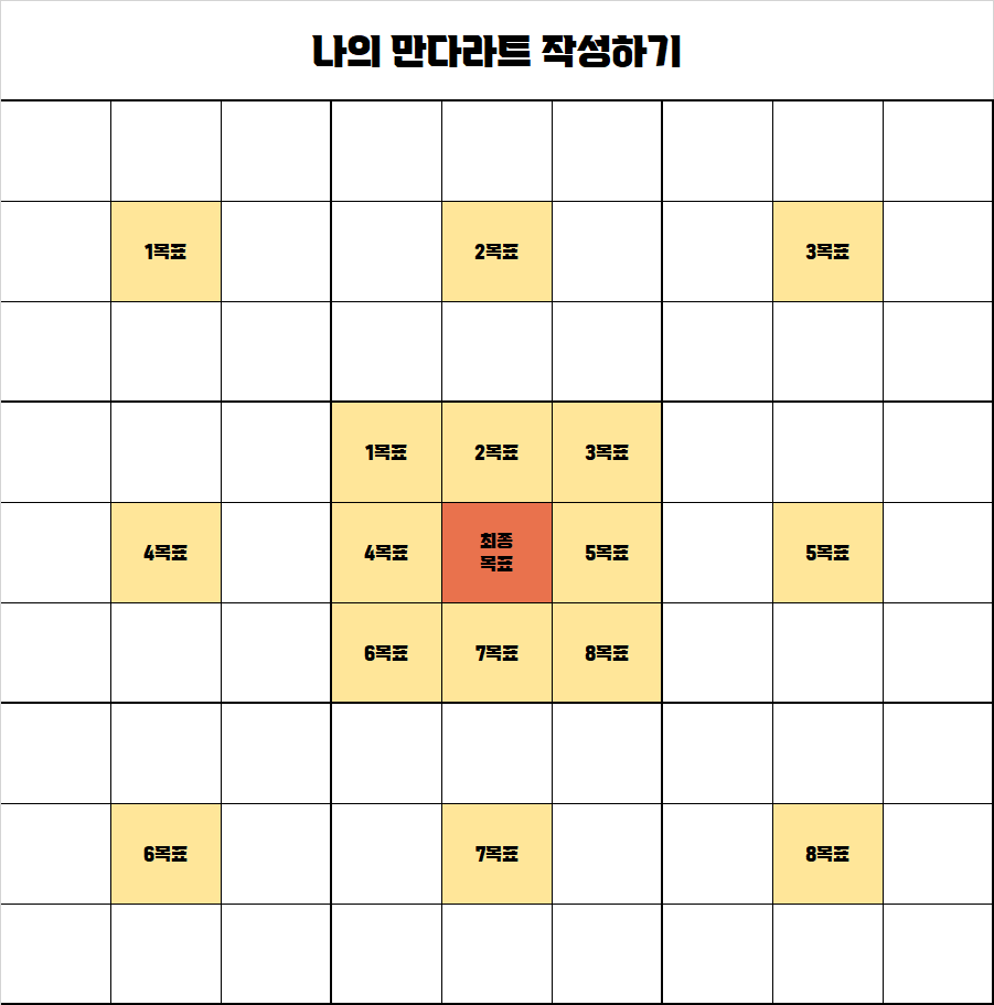 저도 처음 만다라트를 보고 "와 대박이다!"라고 생각하고 바로 파일을 만들어 작성해 본 적이 있었는데, 결국 다 채우지 못했죠. 그때는 그 이유를 알지 못했는데, 이제는 조금 알 것도 같습니다.