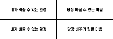 길을 걸어가는데 작은 돌멩이가 많아서 발이 아프다면 그 돌멩이를 다 치우는 것보다는 신발을 신는 게 빠를 테니까요. 이론적으로는 이게 백번 맞는데, 막상 해보면 내 마음이 쉽게 안 바뀝니다. 그래서 조금 더 디테일한 전략이 필요합니다. 주어진 환경과 내 마음을 세심하게 들여다보면 아래와 같이 나눌 수 있습니다.