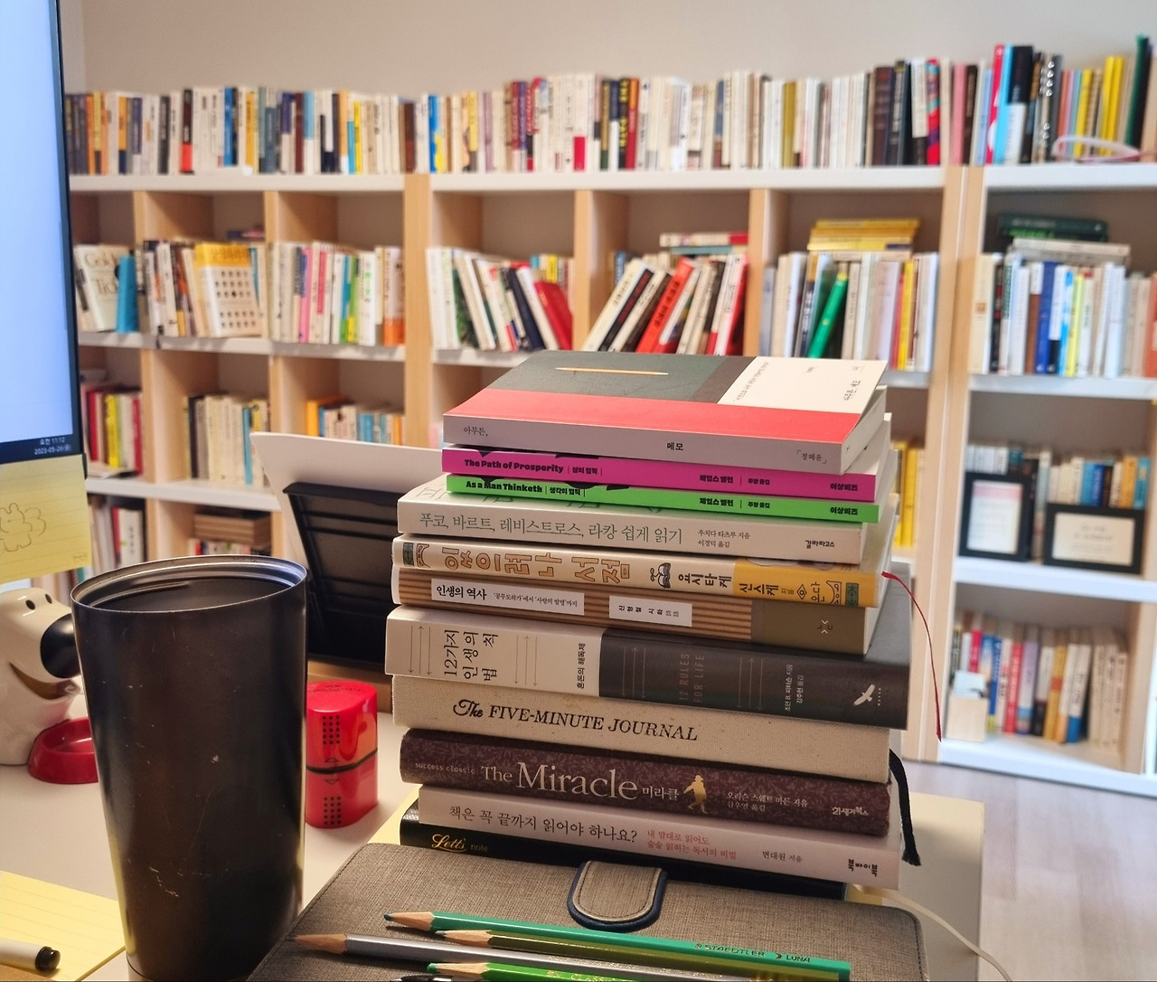 이전에 쓰다만 글들을 살펴보고 일부 내용을 채워 넣은 글도 있지만, 글 하나로 완성하기엔 갈 길이 멉니다. 일어나 이 방 저 방을 기웃거리며 책장들을 살펴봅니다. 오늘은 어떤 책을 읽어볼까 벌써 5권째 책을 뒤적이고 있습니다. 잠깐 읽으려고 했다가 나도 모르게 빠져드는 책도 있고, 이 문장은 글로 써야겠다고 생각해서 가지고 오는 책도 있습니다. 책상 위에 몇 권의 책이 쌓입니다. 오랫동안 책상에 머물러 있는 친구들 중 몇몇은 잠시 책장으로 옮겨줘야겠습니다.