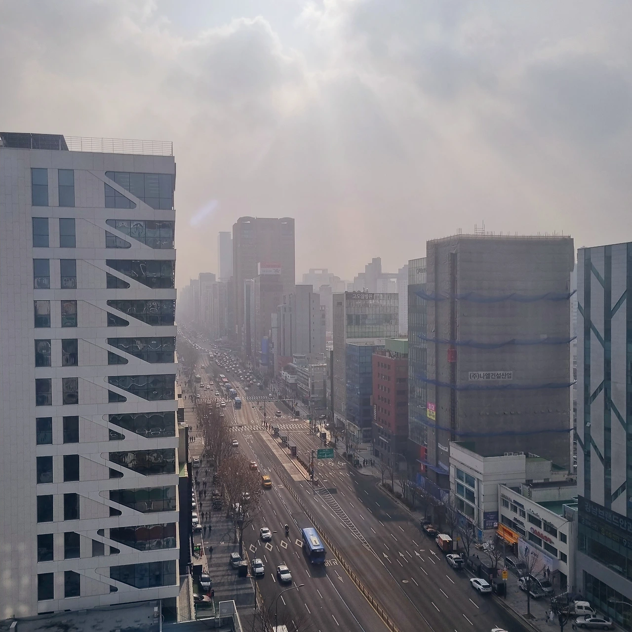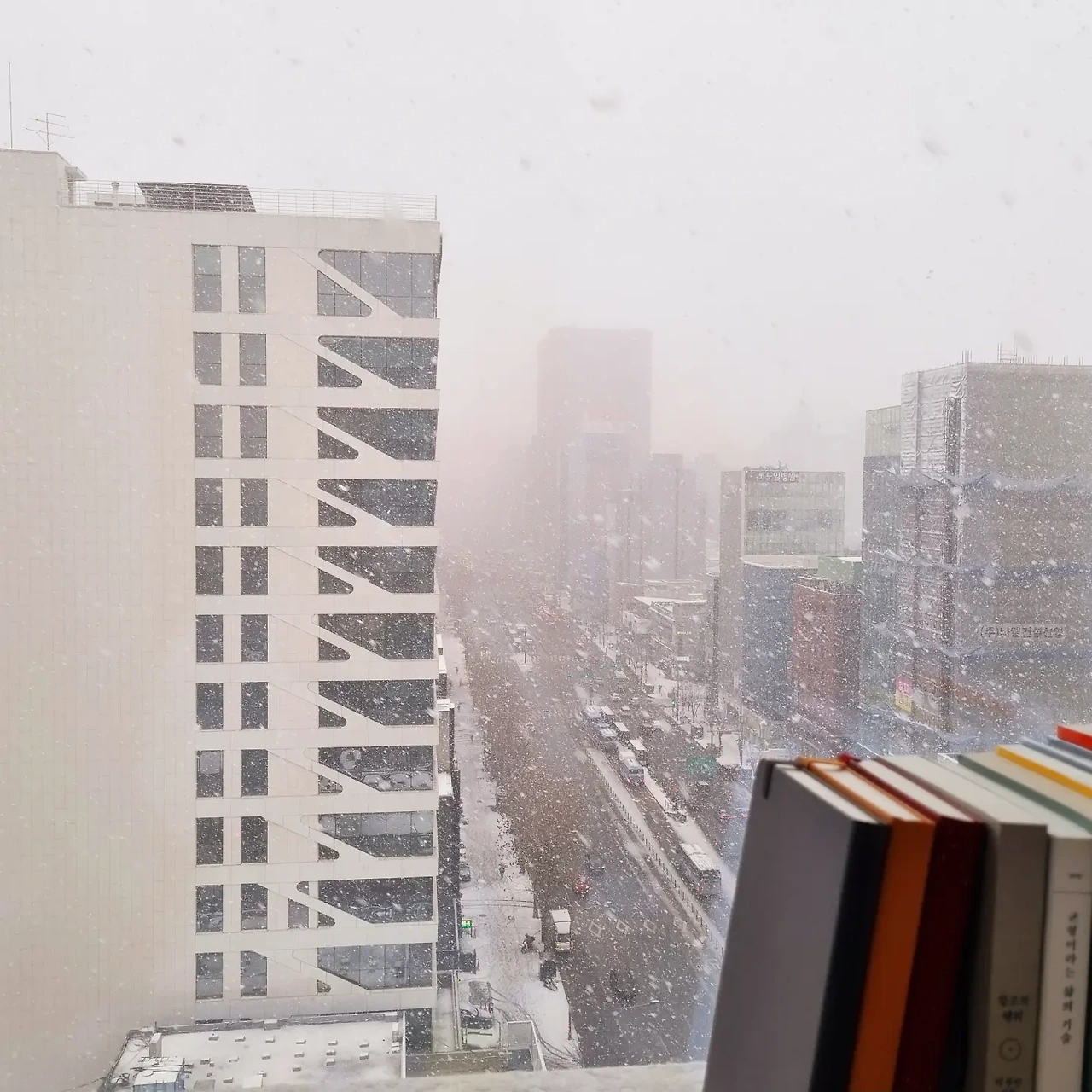 논현역 근처 대로변 빌딩 12층에 있으며, 책상 앞으로 탁 트인 창이 있어서 신논현역 교보타워나 역삼역의 강남파이낸스센터도 보입니다. 이곳은 저의 수직적 공간입니다.