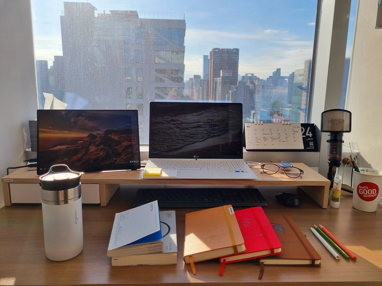 기본적으로 데스크톱을 선호합니다. 32인치 모니터와 27인치 모니터를 듀얼로 쓰고 있고, 게임이나 고사양 작업을 할 일이 거의 없기 때문에 10년 전에 산 좋은 모델을 지금까지 아주 잘 쓰고 있습니다.(책방 사무실) 노트북 역시 올해로 8년째 LG 그램을 쓰고 있습니다.(강남 사무실) 깨끗하게 쓴 편이라 지금도 노트북으로 글을 쓰고 있습니다. 하지만 확실히 성능이나 속도가 많이 떨어진 상태라서 올해엔 좋은 모델로 다시 구입해야 할 것 같습니다. 노트북도 특이하게 듀얼로 쓰고 있는데요. 노트북이 15인치 화면이라 14인치 휴대용 터치스크린을 따로 구비해서 쓰고 있습니다. 컴퓨터에 대해서는 살 때 좋은 걸 구입하고 오래 잘 쓰자는 생각을 가지고 있습니다.