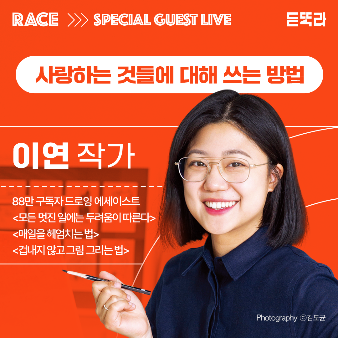 시작은 글쓰기 레이스 2기 마지막 주의 스폐셜 라이브에는 이연 작가님을 모셨습니다. 이연 작가님은 89.8만 구독자를 보유한 유튜브 채널 ‘이연’의 주인장을 맡고 계시면서 그림, 글, 강연까지 방법을 가리지 않고 자신의 이야기를 나누는 분입니다. 유튜브 영상 뿐만 아니라 <겁내지 않고 그림 그리는 법>, <매일을 헤엄치는 법>, <모든 멋진 일에는 두려움이 따른다> 등 책으로도 우리의 곁에 찾아오고 계셔요. 그림, 말하기, 글쓰기까지 자신의 우물을 넓게 확장해 나가는 이연 작가의 비결을 시작은 글쓰기 2기 스페셜 라이브에서 나누어 주셨습니다.