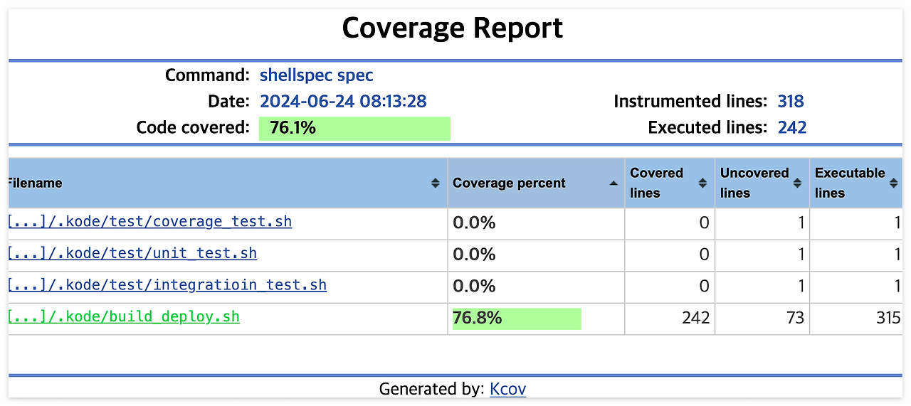 이대로 계속 진행하는 것은 비효율적이라 판단하고 shell script 테스트 환경 구성을 먼저 해야겠다고 결정하였습니다. ShellSpec이라는 프레임워크를 발견하고 대략 훑어보니 직관적이고 쉽게 테스트할 수 있을 것 같아서 이것으로 테스트 환경을 구성해 봤습니다. kcov라는 코드 커버리지툴과 연동이 잘 되어 있어서 이 부분도 추가였습니다.