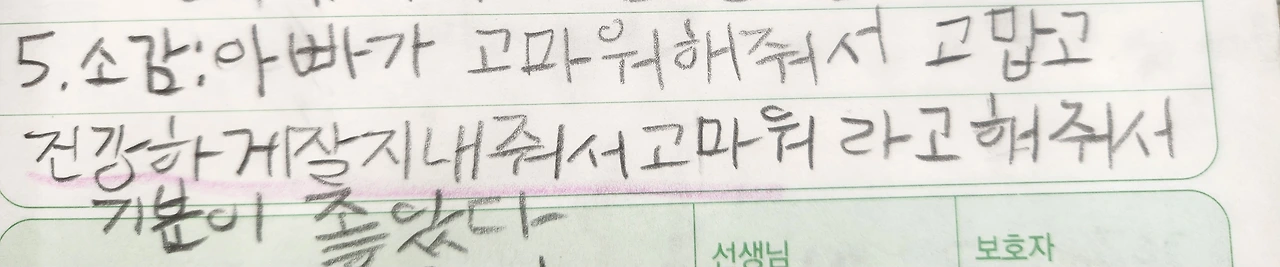이 친구는 아빠에게 고마운 마음을 표현했네요. 아빠도 화답해 주셔서 서로 마음을 주고받는 시간을 보냈을 것을 생각하니 마음이 따스해집니다. 아버님께서 해주신 말씀을 잘 기록해서 소감으로 남긴 것을 칭찬해 줍니다^^