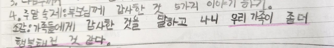 감사를 표현하는 것은 돈이 드는 것도 아니고, 시간이 많이 걸리는 것도 아닙니다. 그런데도 우리는 감사한 마음을 표현하는 것에 매우 어려움을 느낍니다. 그 대상이 가깝고 친밀한 대상일수록 더 그렇지요. 우리 아이들에게 부모님과 가족은 어쩌면 너무나 당연한 존재들이기에 고마움을 느낄 필요가 없을 수도 있고요. 그래서 첫 번째 숙제로 가족에게 고마움을 표현해 보도록 하면 아이들은 당황하고, 어색해하고, 곤란해합니다. 그런데 일단 해보면 어떨까요? 숙제라는 것을 알면서도 그 마음을 전달받은 대상은 또 어떨까요?