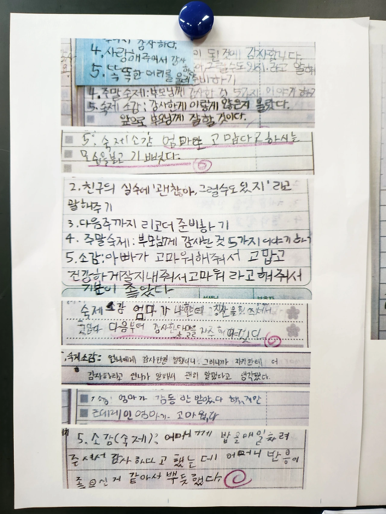 5가지를 쓰고 이런 소감이라니! 다음에는 10가지를 떠올려보라고 해야겠어요. (실은 몇 해 전에는 50가지를 써보라고 한 적도 있어요. 그랬더니 뒷부분은 형식적인 내용으로 채워지더라고요. 뭐든 적당히^^;)