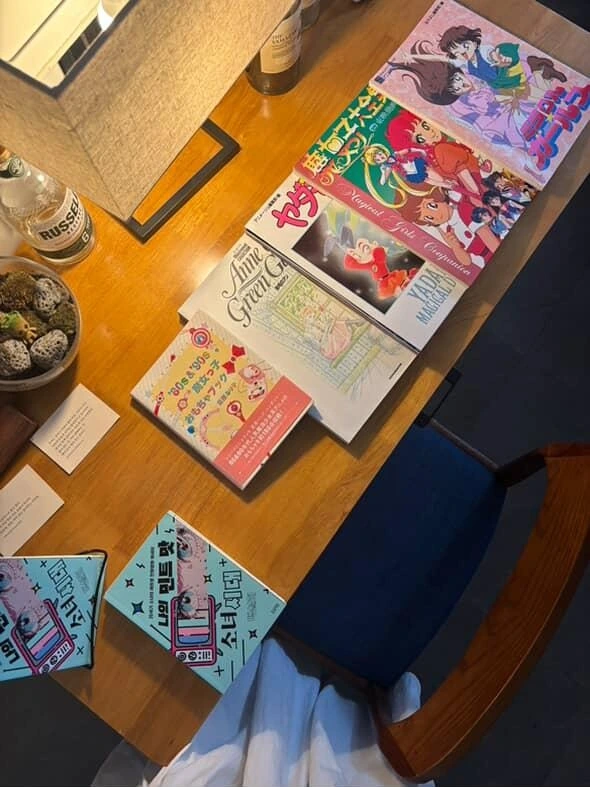 이번에도 가가99페이지에서처럼 독자분들이 앉을 자리에 굿즈를 깔아보았어요.