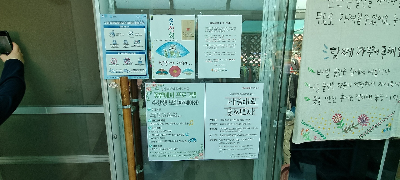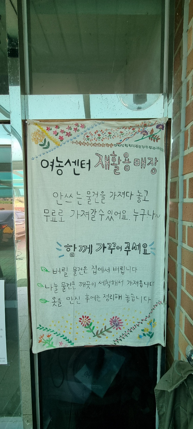 게시판의 뒤쪽으로는 음식물이 아닌 다양한 물건들도 나눔되어 있었다. 초등학교 문제집과 아이들 장화에서 하이힐, 청바지등이 전시되어 있었다. 시골 여성들은 농부이기 전에 엄마이기 때문에 자녀 교육에도 신경을 써야 한다. 하지만 도시처럼 학원이 많은 것도 아니고 교재 하나도 쉽게 살 수 있는 환경이 아니기에 이런 나눔은 농사에 바쁜 엄마들에게 큰 힘이 될지도 모른다는 생각이 들었다.