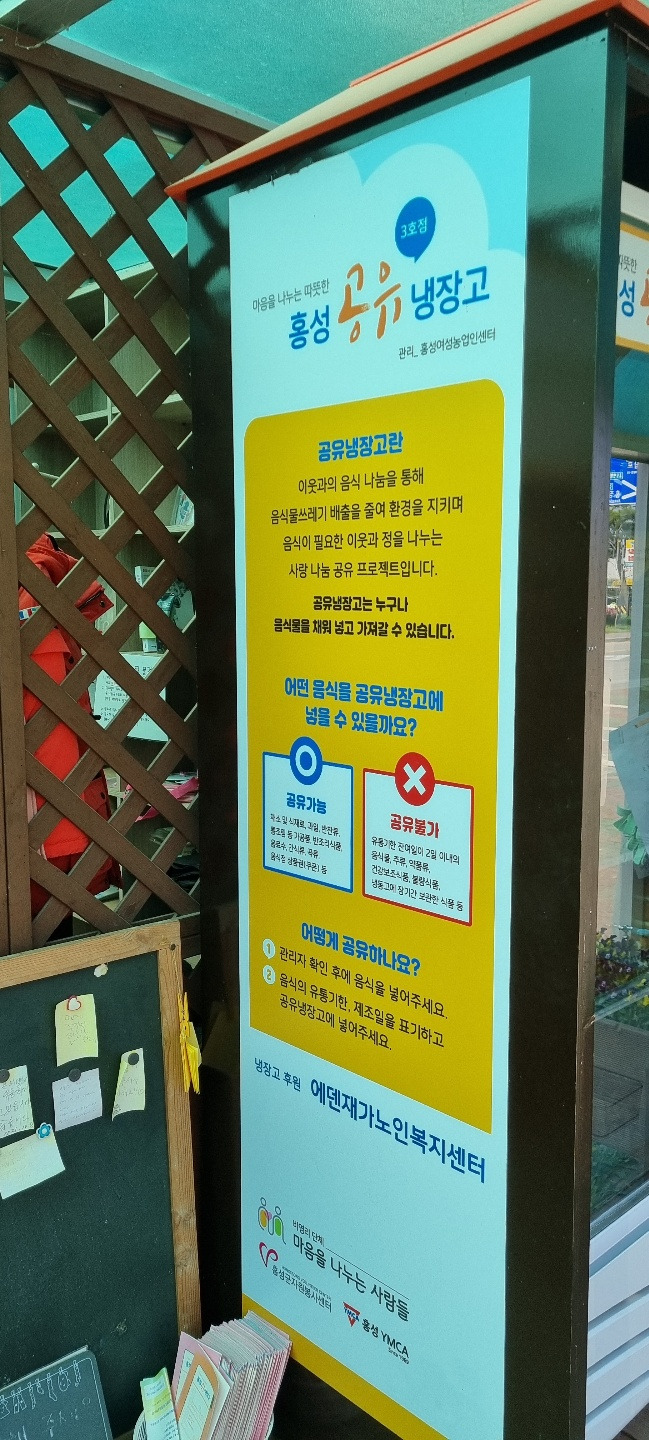 홍성여성농업인센터는 1층과 2층으로 구성되어 있다. 현재 1층은 공유공간으로 사용되고 있다. 주로 음식과 의류 등을 나눔을 통해 공유하고 있다. 공유냉장고가 있어서 불필요한 음식을 넣어두고 필요한 만큼의 음식을 가져 갈 수 있다. 농사 이외에도 매끼니마다 가족의 식탁을 책임져야 하는 여성 농업인들은 반찬거리가 고민일 수 밖에 없다. 도시처럼 집근처에 마트가 있지 않기 때문에 필요할 때 언제든지 가족의 먹거리 문제를 해결해야 하는 여성농업인들에게는 이런 공유 냉장고가 대형마트나 새벽배송 만큼이나 요긴한 존재가 아닐까