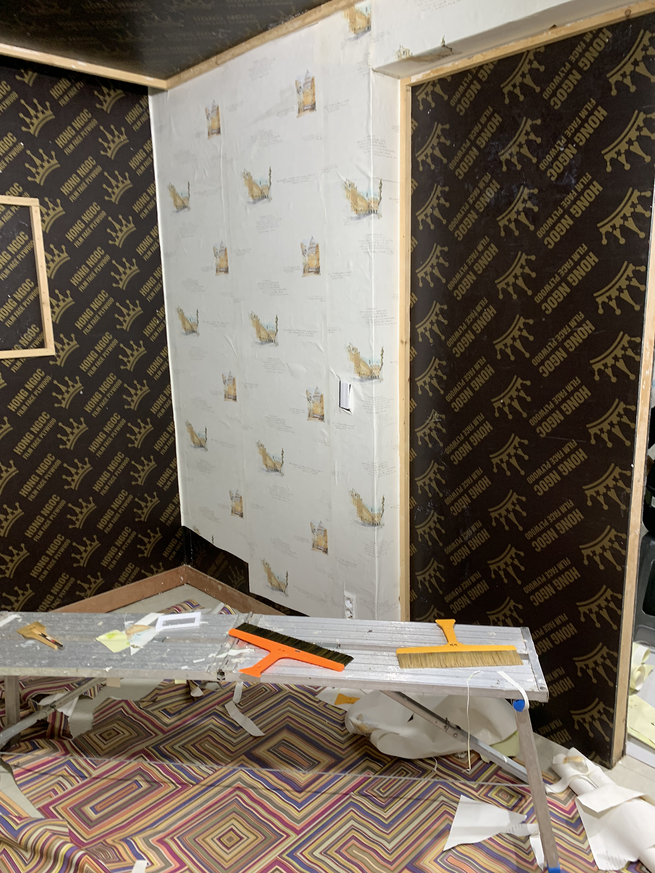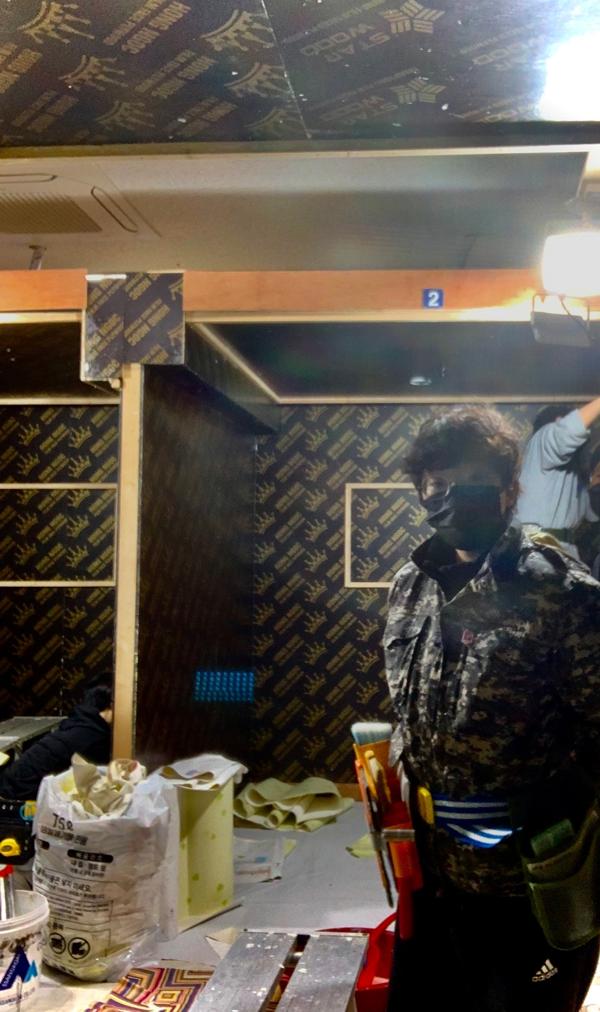 그래서 우리는 정배를 30분 만에 끊어야 하는 숙명을 안게 되었다. 목공과 같은 점이 먼저 보였다면, 목공과 다른 점도 서서히 눈에 들어온다. 예를 들면 먼지가 없는 것. 우리는 벽지에 풀칠하는 일이니까, 샌딩은 필요도 없고 세멘을 개는 일도 아니니까. 그리고 기본적으로 혼자 척척척 해나가는 점이 있다. 물론 그때문에 사용 가능 공간이 축소되어 앉은 자세로 재단과 풀칠과 숙성을 마치고, 우마에 올라 작업에 쓸 풀칠한 소폭을 옆에 늘어놓고 위에서부터 연달아 붙인다. 그리고 한꺼번에 자르고, 위의 일을 마치고 우마 아래로 내려와 중간의 미미선을 맞춘 다음 아래 걸레받이로 내려간다. 골칫거리는 이음새에 풀이 많아 커터로 자르려다 찢기는 경우. 위의 탈락 경우에서 벽지가 지나치게 찢어지면 그 또한 탈락이었다. 여분의 용지가 없으니까. 그리고 '보'(지금의 건축엔 거의 없지만)가 있는 벽을 바를 때에는 보 밑에서 1로 끊고, 그 다음 다시 소폭을 그대로 위에 붙이는 방식이다. 도배는 쓰레기가 굉장히 많이 나와 다들 방 밖의 중앙 통로로 쓰레기를 던져놓는다. 그리고 수정 만능이 될 수 없는 게 도배지는 한정이 있으니까, 첫 재단에서 망하면 게임 끝이다. 물론 이건 목공도 마찬가지다. 다루끼 말고 오비끼 같은 비싼 걸로 다리를 하려다가 괜히 망할 때 처럼.그리고 커터 날도 굉장히 많이 쓰기 때문에, 그것도 엄청 많은데 일일이 모아 버리기 힘들어 보였다. 나는 주로 풀 바구니를 닦거나 부직포로 풀을 닦아내거나 우마를 옮기거나 하는 청소를 맡는다. 청소 시간 자체도 삼십 분은 걸린다. 쓰레기봉투도 매번 4개 정도 나오는 것 같고.