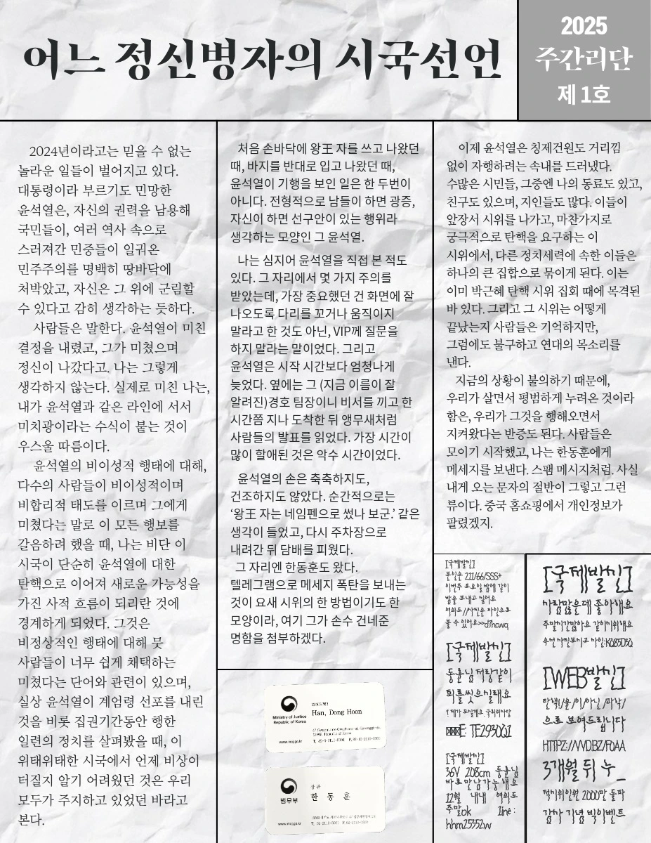 그러니 정신병자인 나도 지극히 마이 오운 프라이빗한 시국선언을 할 수 있지 않은가? 이것이 2025년의 주간리단의 시작이다.