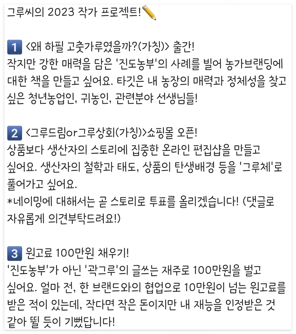 인스타그램(https://www.instagram.com/jindomiss/)에 올린 2023년 작가 목표�