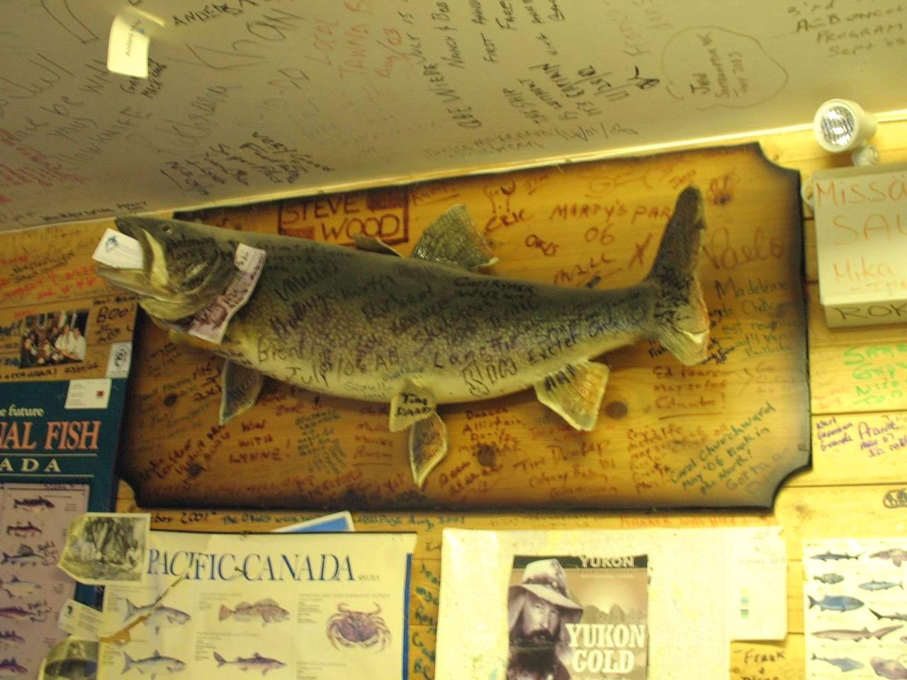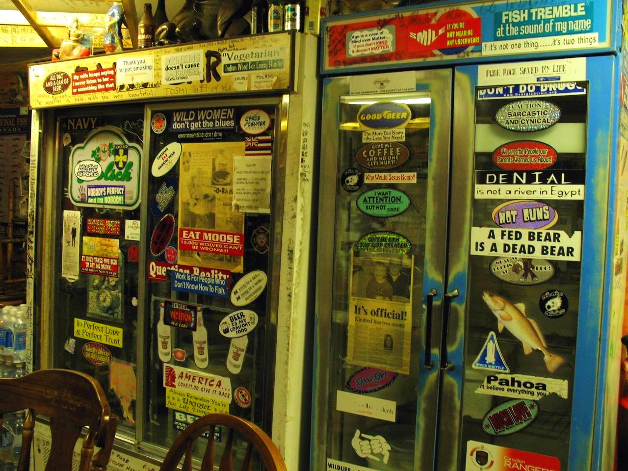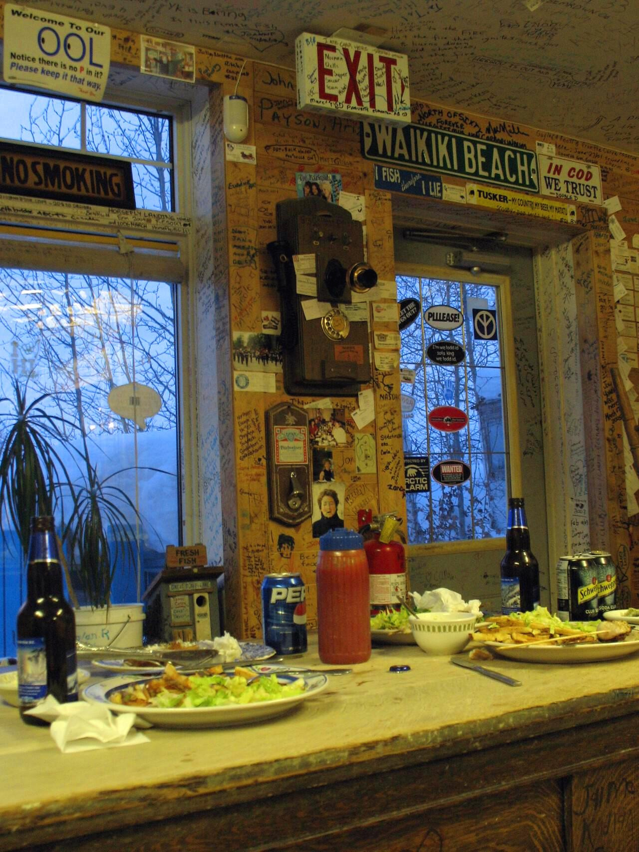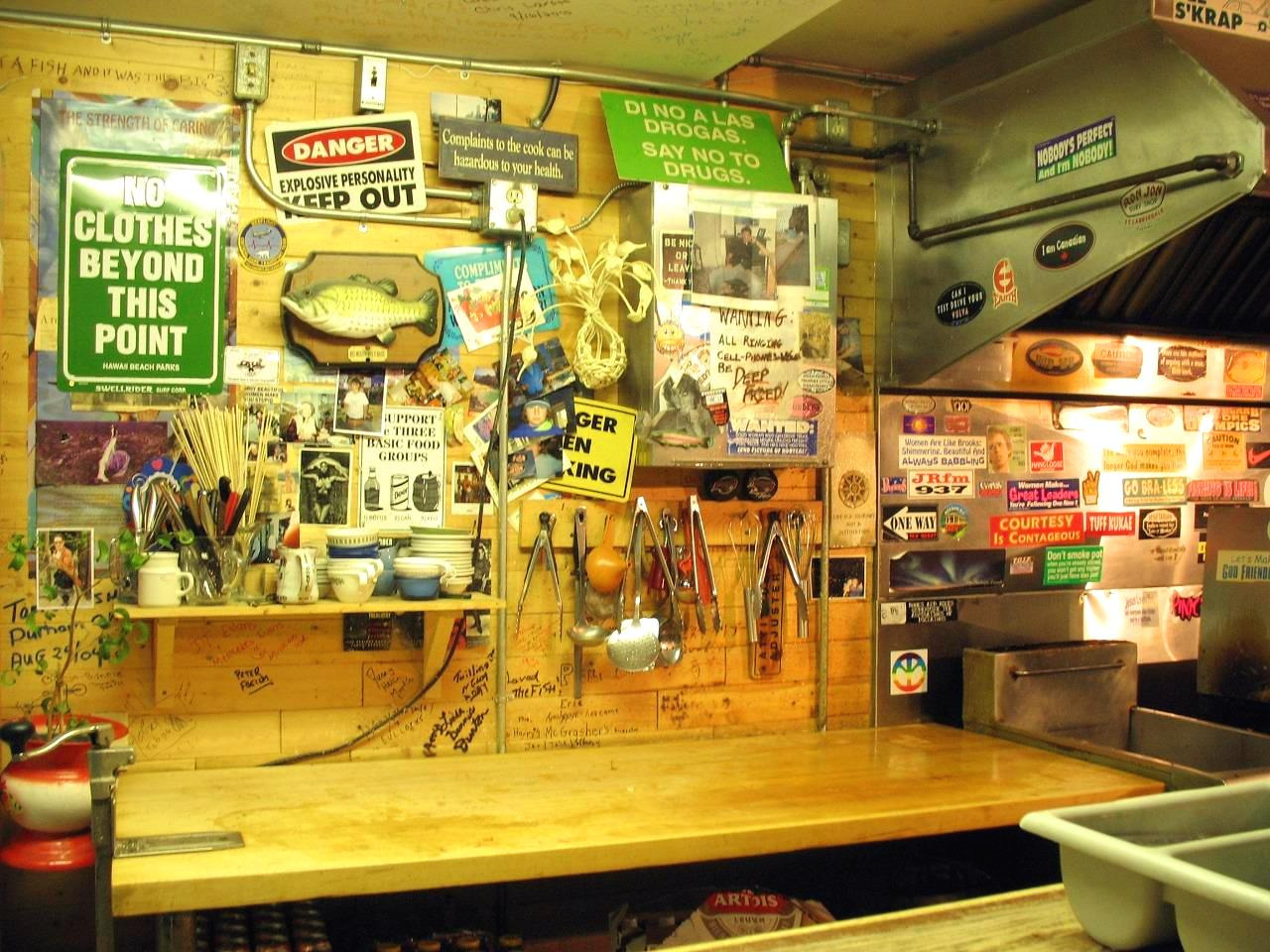 과장이 아니라 말 그대로 '바닥부터 천장까지' 사진과 포스터가 빼곡하게 붙어있고, 온갖 표지판과 스티커가 냉장고와 주방을 점령했으며, 여기저기 붙은 생선 모형에는 온갖 나라 지폐가 꽂혀 있다. 뿐만 아니라 천장에는 그동안 방문한 손님들이 남긴 '나 여기 왔다감!!' 메시지의 향연이 펼쳐진다.