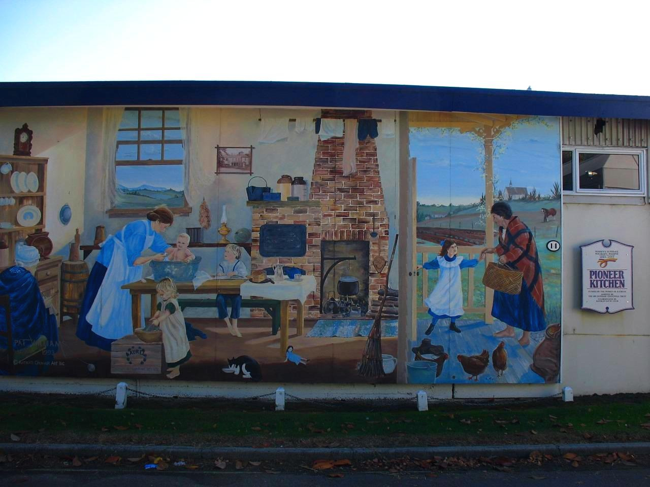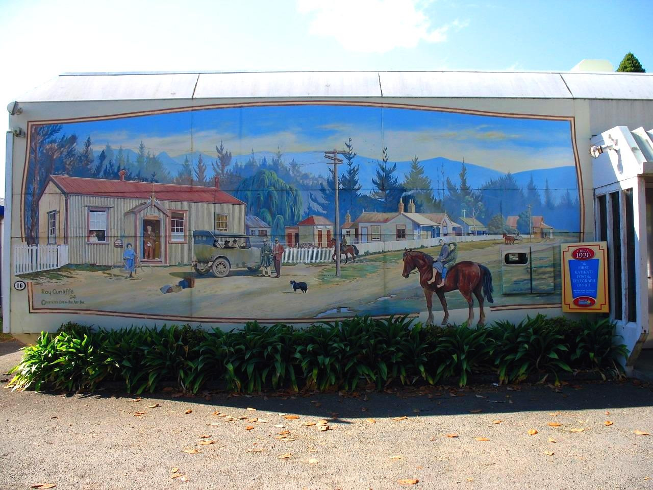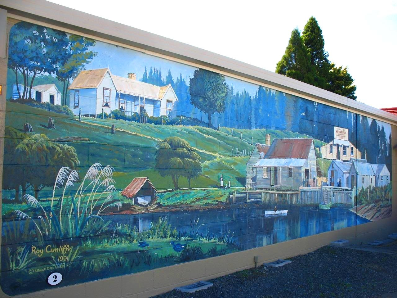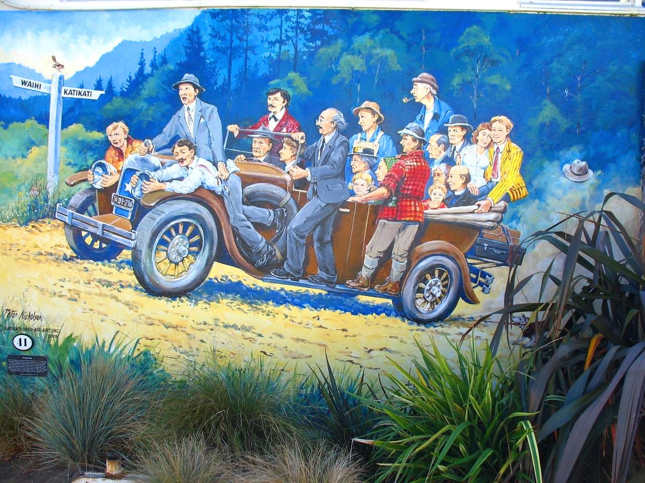 카티카티는 작은 마을이지만 벽화 하나만큼은 뉴질랜드의 그 어떤 도시보다도 많다. 뉴질랜드의 벽화 마을 Newzealand’s Mural Town 이라는 자부심도 대단한 것 같다. 마주 오는 사람도 드문 이 작은 마을 구석구석에 역사적인 그림들이 가득하다. 정착하던 시기 사람들이 어떻게 지냈는지 보여주는 그림들이라, 그 당시 풍경이나 옷차림, 오래된 차와 동물들을 보는 재미가 쏠쏠하다.