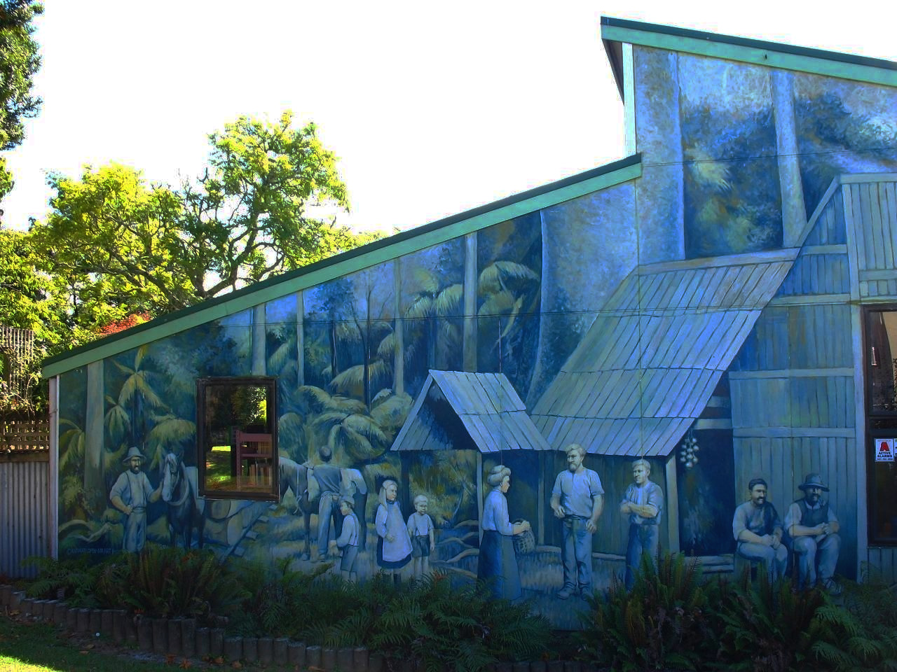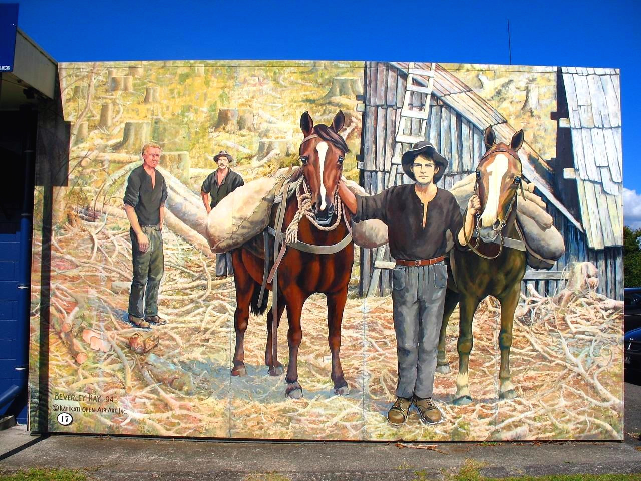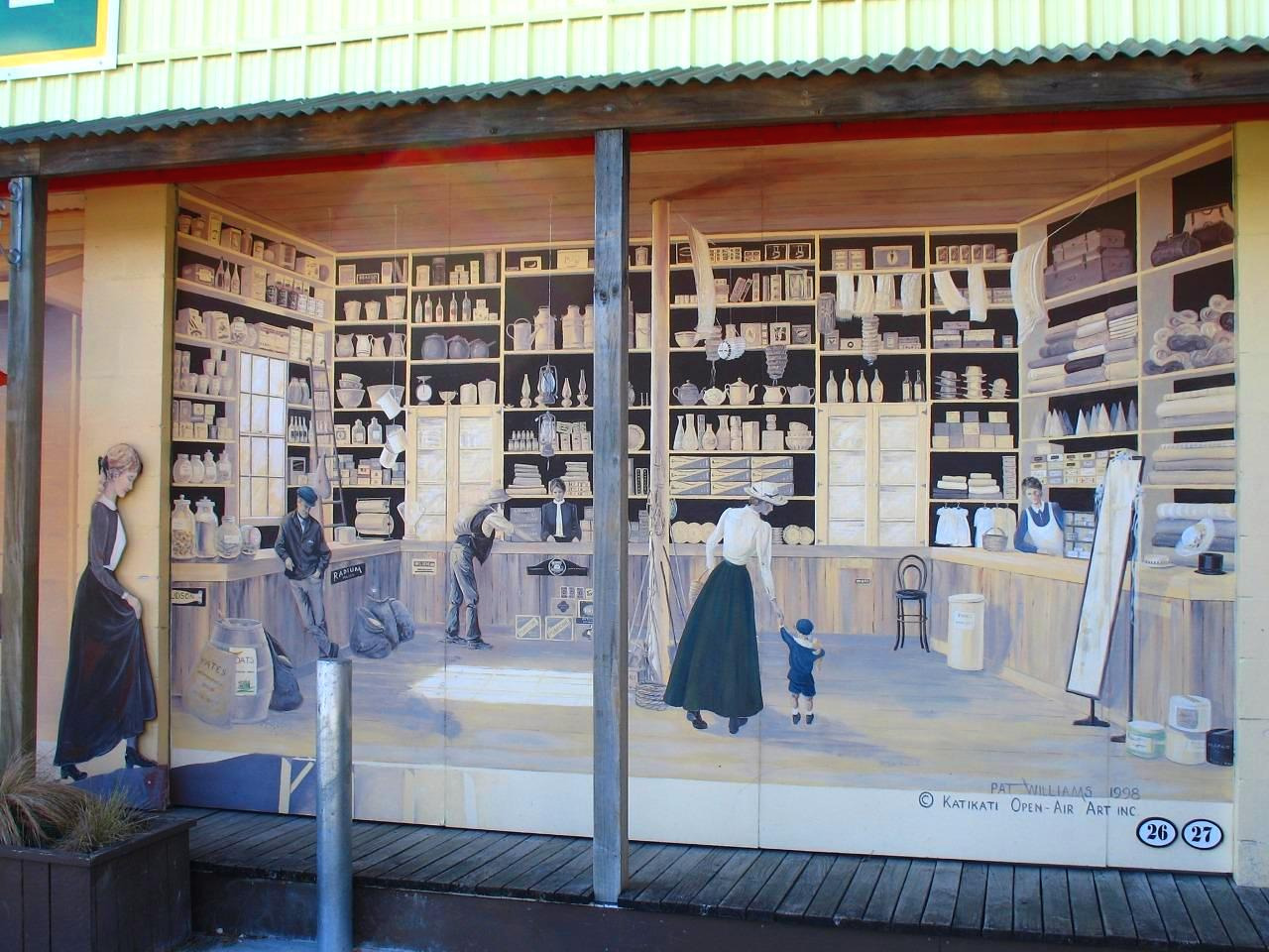 카티카티는 작은 마을이지만 벽화 하나만큼은 뉴질랜드의 그 어떤 도시보다도 많다. 뉴질랜드의 벽화 마을 Newzealand’s Mural Town 이라는 자부심도 대단한 것 같다. 마주 오는 사람도 드문 이 작은 마을 구석구석에 역사적인 그림들이 가득하다. 정착하던 시기 사람들이 어떻게 지냈는지 보여주는 그림들이라, 그 당시 풍경이나 옷차림, 오래된 차와 동물들을 보는 재미가 쏠쏠하다.