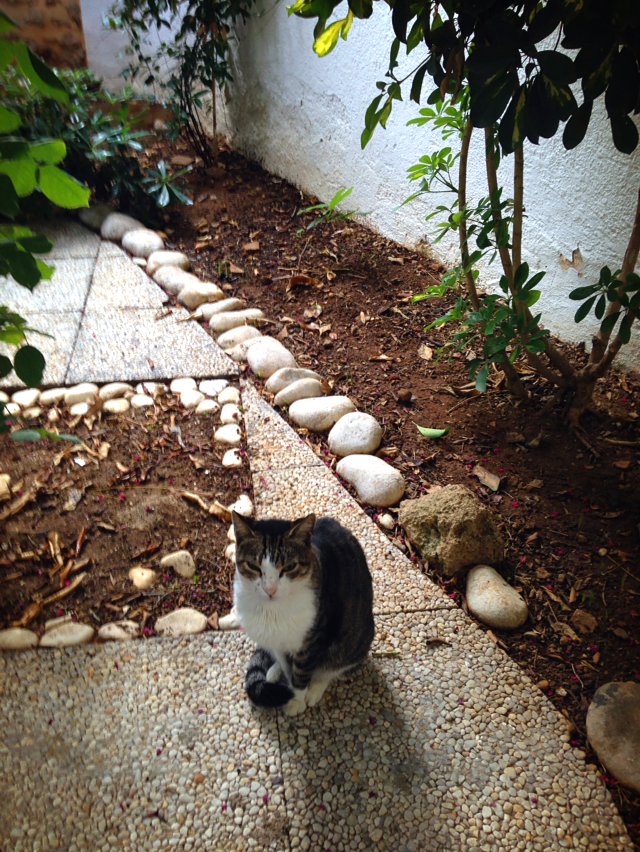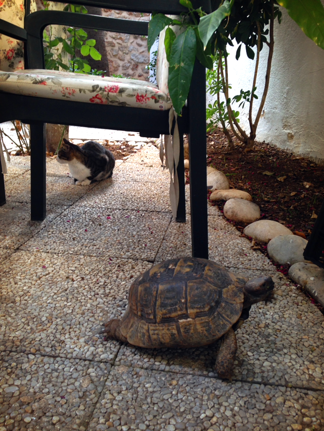 아침에 조식을 먹으러 나와 테이블을 잡기가 무섭게 고양이 한 마리가 옆에 앉는다. 그리고 난데없이 거북이 한 마리도 막 뛰어(!) 나온다. 뜬금없는 묘한 대치상황.