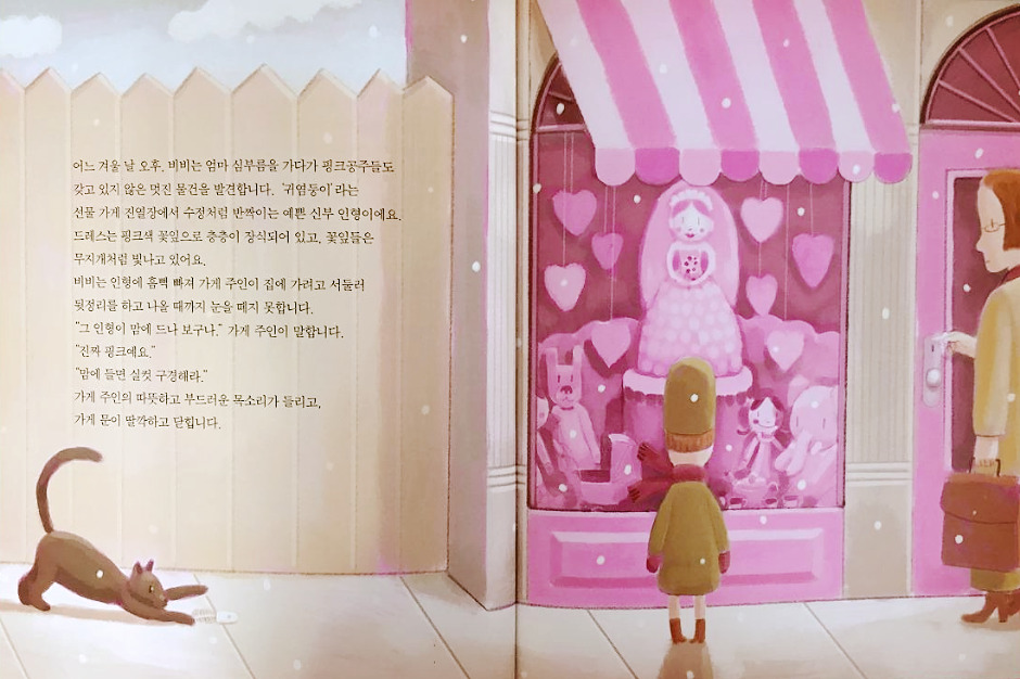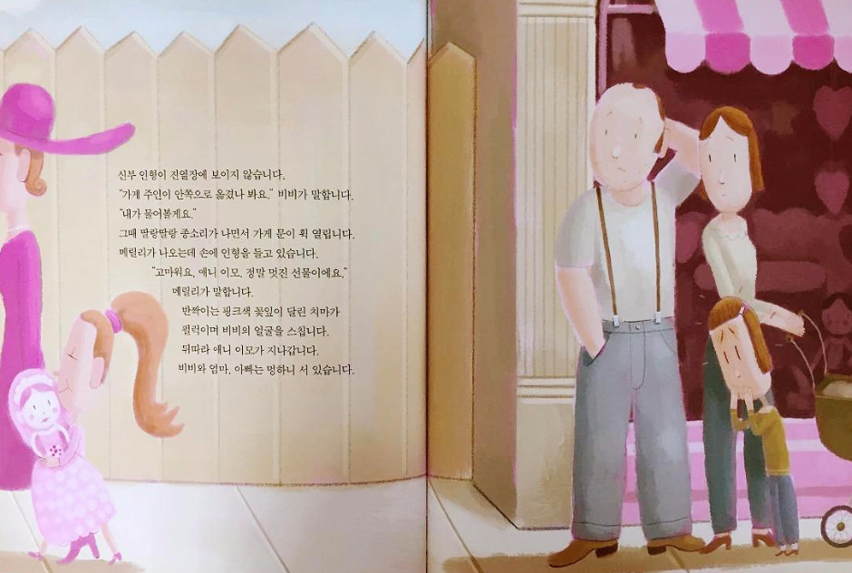 어느 날 오후, 비비는 선물 가게 진열장에서 '진짜 핑크'를 발견합니다. 핑크색 드레스를 입은 반짝거리는 신부 인형이었지요. 비비는 신부 인형을 실컷 구경할 수는 있었지만 가질 수는 없었지요. 아무리 심부름을 해서 용돈을 모아도, 신부 인형은 도저히 살 수 없을 정도로 비쌌기 때문입니다.