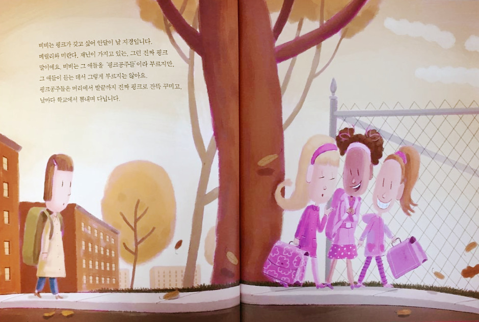 비비는 핑크를 좋아하는 아이입니다. 학교에는 '진짜 핑크'를 잔뜩 가지고 있는 핑크공주들이 있어요. 비비는 그 애들을 부러워합니다.
