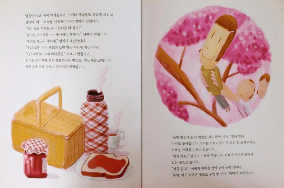 어느 날, 비비는 엄마 아빠와 소풍을 가기로 했습니다. 핑크 놀이를 위한 소풍이었지요. 엄마는 딸기잼 샌드위치와 앵두차를 준비합니다. 빵집에 들러 핑크로 꾸민 작은 케이크도 사고요. 아빠의 트럭을 타고 온통 핑크색으로 물든 공원으로 향했습니다.