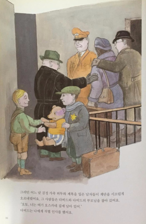 사람들은 다비드 가족을 '유태인'이라고 부르며 이상하게 보기 시작했어요.(오토 눈에는 모두 똑같아 보였는데도 말이지요!) 결국 다비드 가족은 어딘가로 끌려가고 말았지요. 다비드는 오토를 오스카에게 맡겼어요. 둘은 날마다 다비드를 그리워했어요.