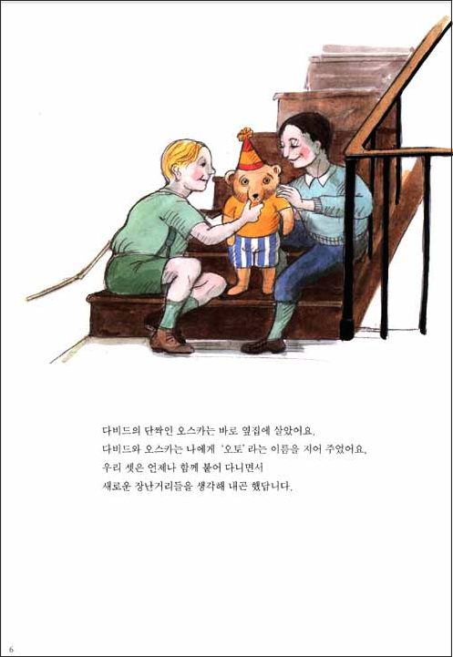 그런데, 골동품 가게 진열장에 놓여 있던 오토를 누가 발견해 데려갔는지 아세요? 바로 오스카였어요! 그리고 오스카와 다비드, 오토는 어린 시절처럼 다시 뭉쳤어요. 다비드의 가족은 강제 수용소에서 죽었고, 오스카의 가족은 전쟁터에서 목숨을 잃어 예전과 꼭 같다고는 할 수 없었지만요.