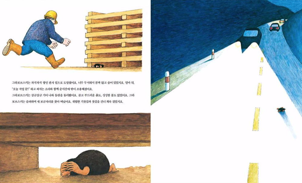 그라보브스키는 너무 무서워서 꼼짝 않고 숨어 있다가 조용해진 다음 밖으로 나왔어요. 그라보브스키에게 필요한 것은 평범한 두 가지, 부드러운 흙과 싱싱한 풀뿐인데 다 사라지고 없었지요. 그라보브스키는 새 보금자리를 찾아 떠나기로 했어요. 커다란 도로를 건너는 위험한 여행이었지요!