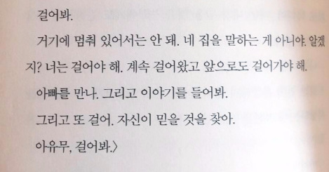 아침부터 비가 왔고, 부쩍 추워져서 이제 가을 곧 겨울이 오려고 한다. 추워지면, 갑자기 나는 얼어붙는 것 같다. 우울의 그림자가 저 멀리, 나를 보고 있는 것이 느껴져서. 끝없이 걷고, 걷는다. 그림자를 향해 내게 다가오지 말라고 소리치면서. "계속 걸어왔고, 앞으로도 걸어가야 해."