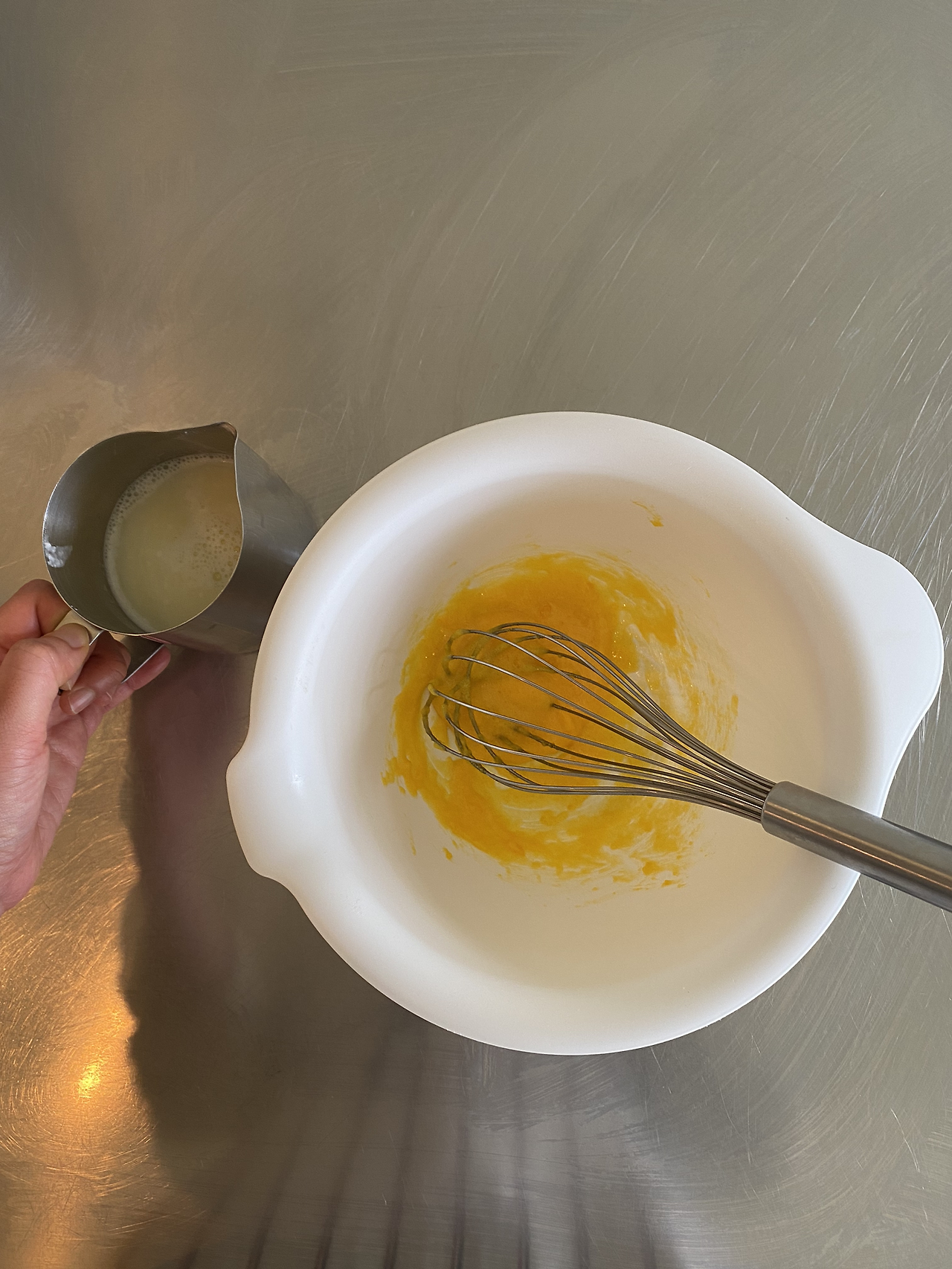 4.계란물에 생크림 혼합물을 한국자씩 떠서 잘 섞어주다 조금씩 나누어 넣어주며 거품기로 저어 줍니다. 이때 한꺼번에 따뜻한 생크림을 많이 넣으면 계란이 익어버리니 조심해 주세요.