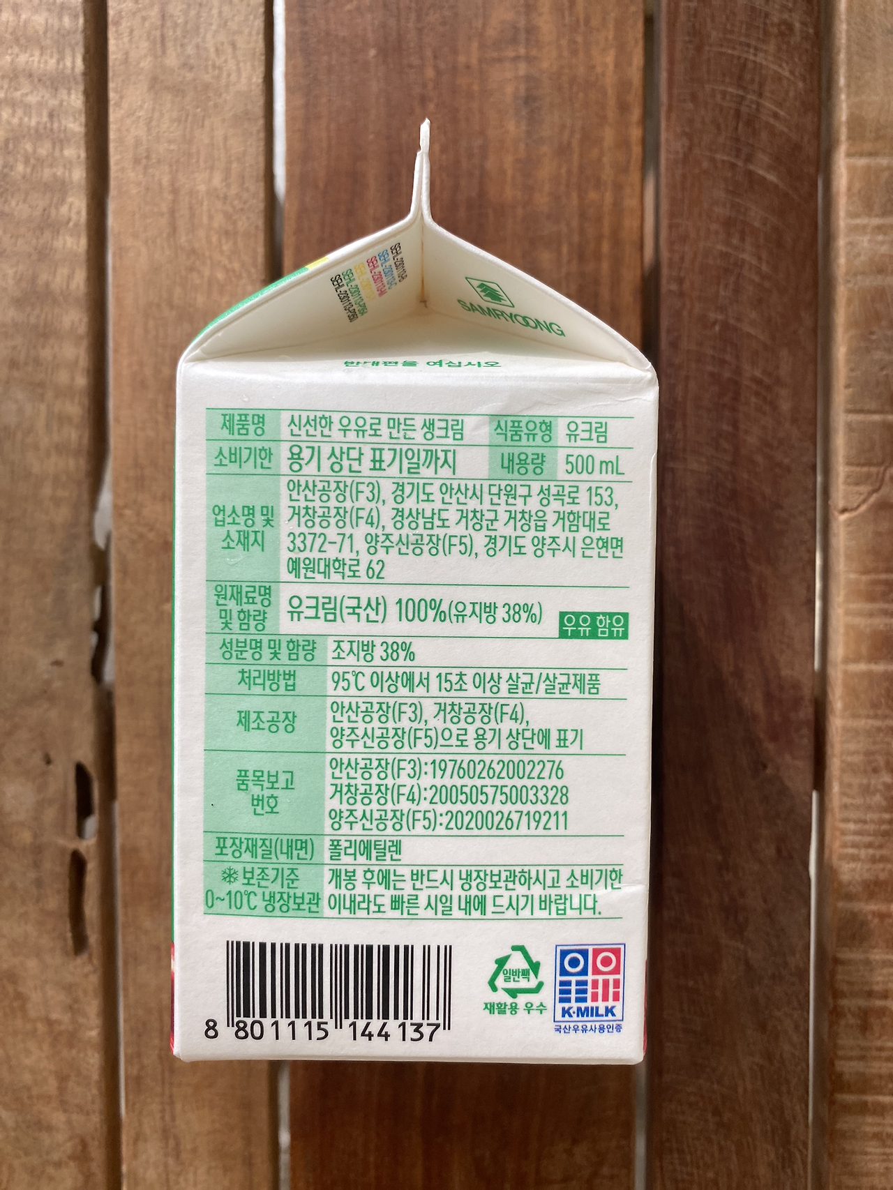 생크림은 브랜드와 상관없이 뒷면 원재료와 함량 부분을 확인해서 유크림 100%로 된 제품을 사용해 주세요. 식물성 지방이나 첨가제가 들어간 휘핑크림을 사용하는 것보다 훨씬 부드럽고 풍부한 맛이 납니다.