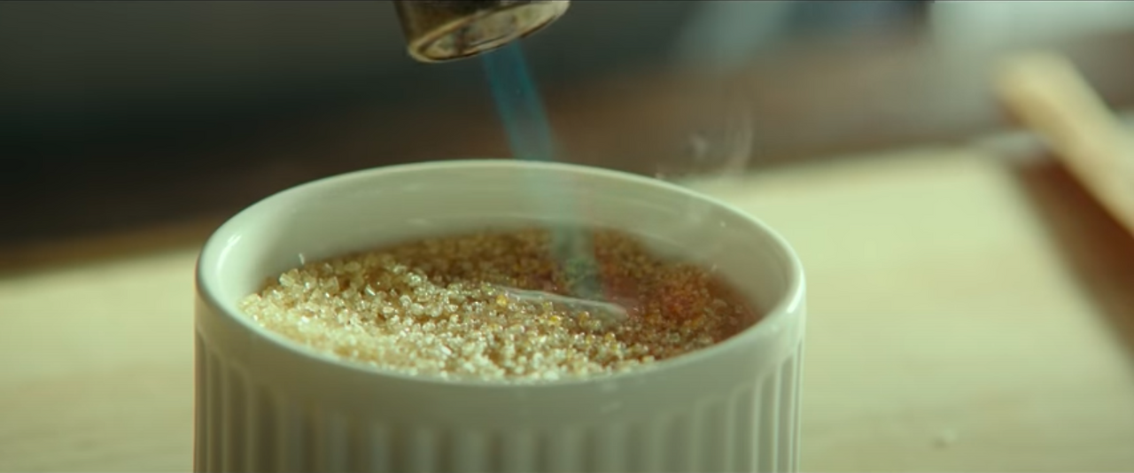 그 비밀은 커스터드 위에 설탕을 흩뿌린 뒤 토치로 열을 가해 설탕이 녹으면서 캐러멀화 되며 색이 짙어지고 달콤 쌉싸름한 맛을 내요.