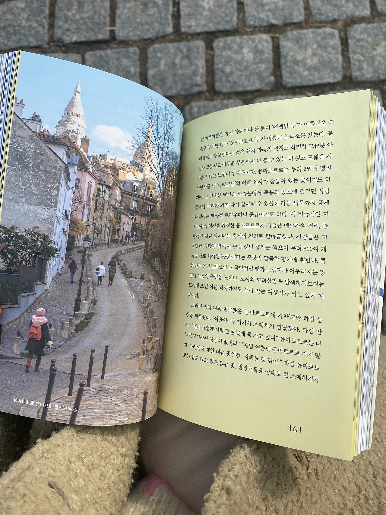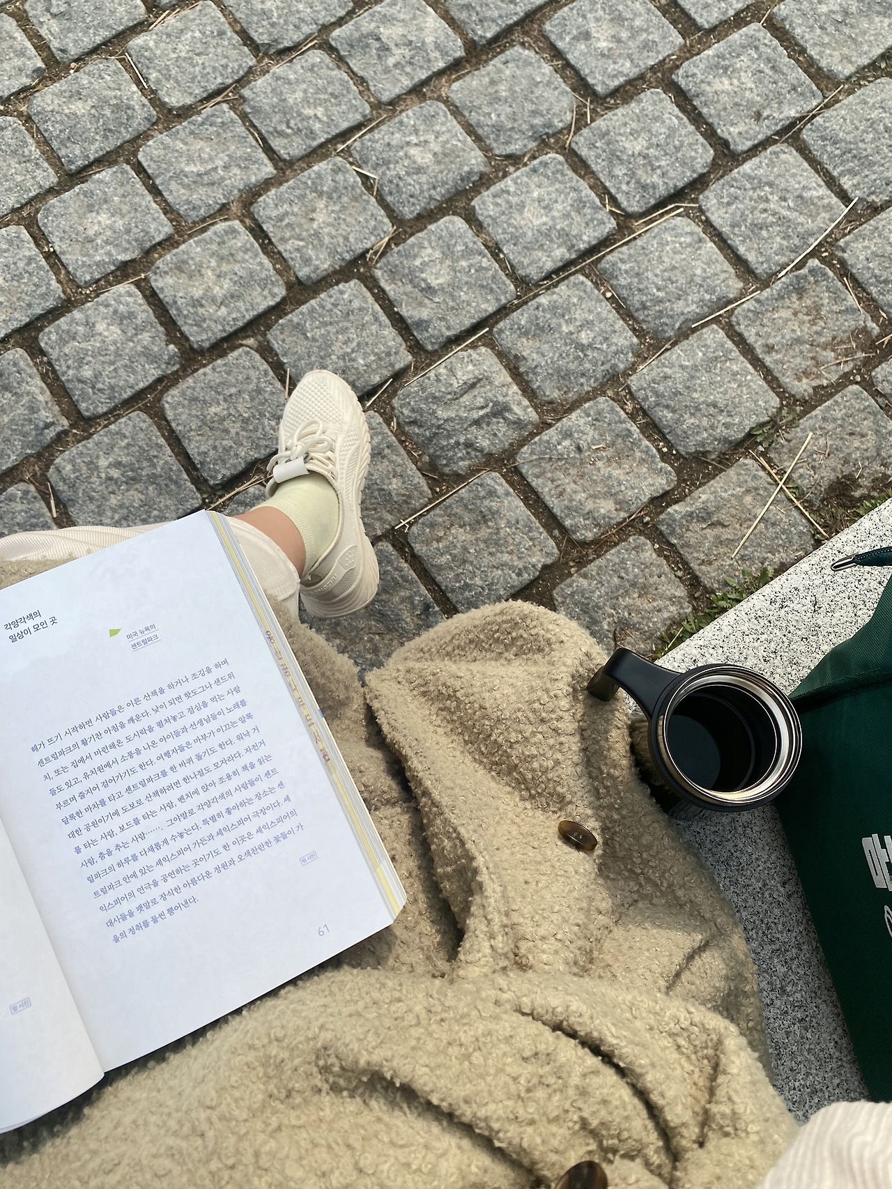 공원에서 커피를 마시며 책을 읽는다.