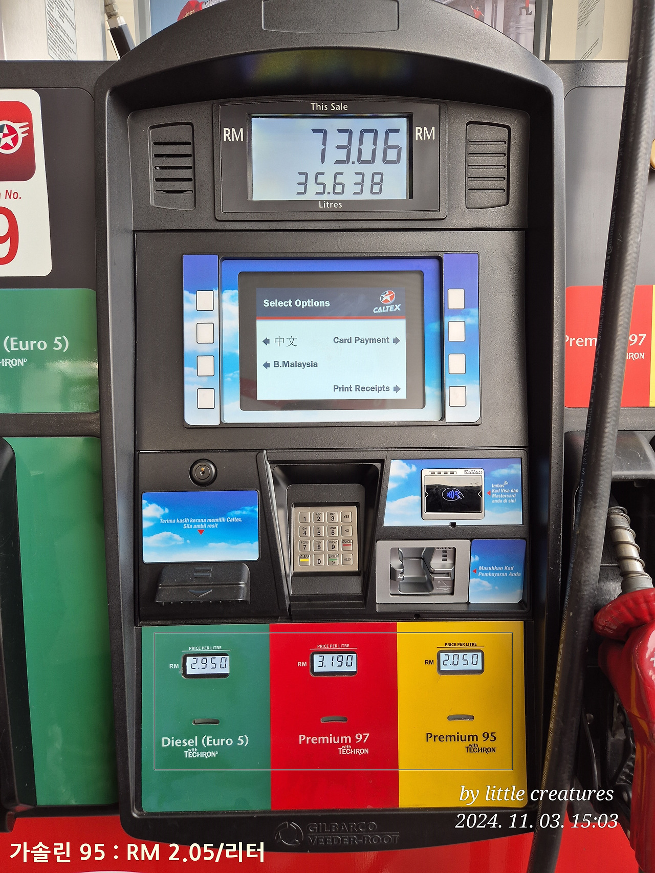 13일간 말라카 1회, 싱가포르 2회, 데자루 1회 등 총 1,900km을 운행하였고, 가솔린 95를 138리터 급유하고, 주유비로 약 9만원(RM2.05/리터) 지출하였다.