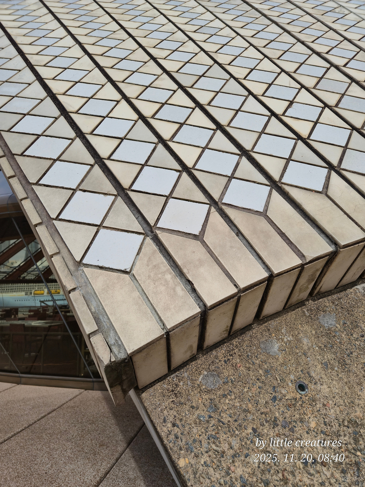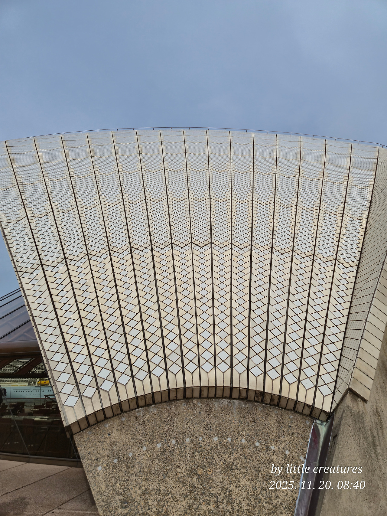 덜 흔한 포인트 하나는 오페라하우스의 멋진 3차원 곡선의 외장재가 작은 세라믹 타일이라는 것이다. 개인적으로 아주 흥미로웠다.