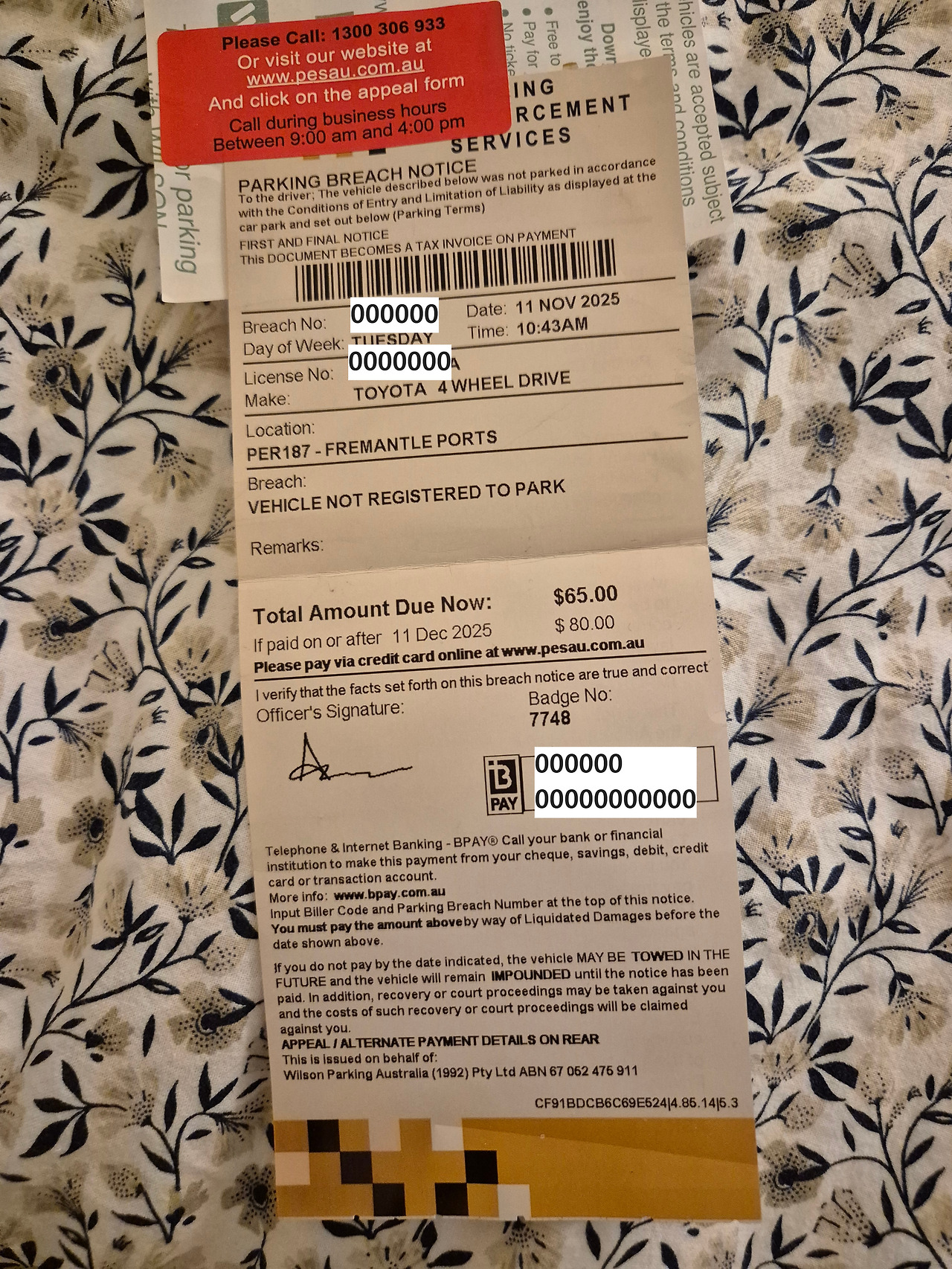 로트네스트에 가기 위해서 프리맨틀 Shed B에 주차하였고, 다녀와서 주차비(A$ 12)를 결제하고 나서야, 앞 유리창에 붙어있는 주차딱지(A$65)를 발견하였다.