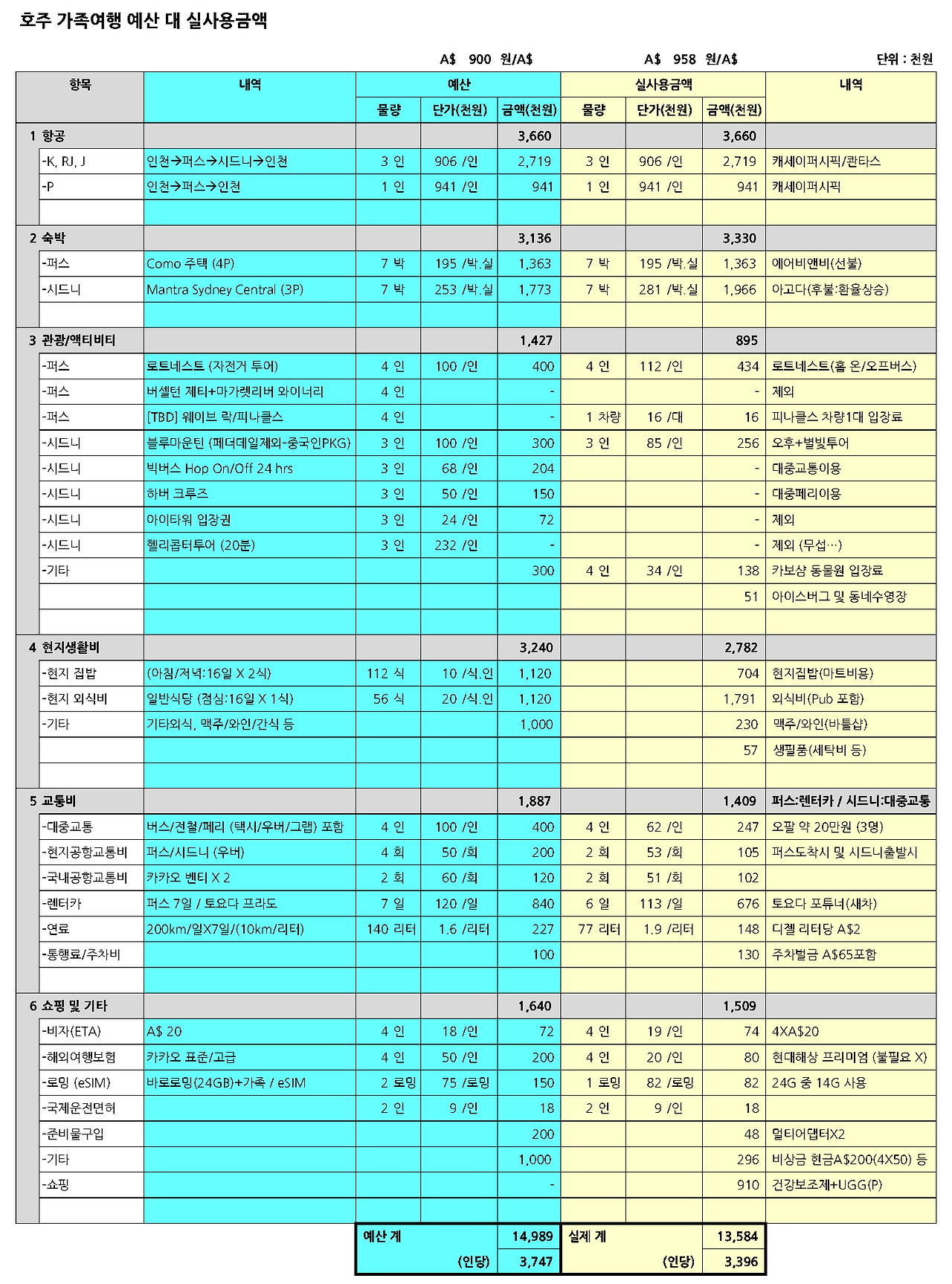 호주의 비싼 물가를 감안하여 Budget Trip컨셉으로 예산을 작성하였고, 적당히 아껴 썼다.