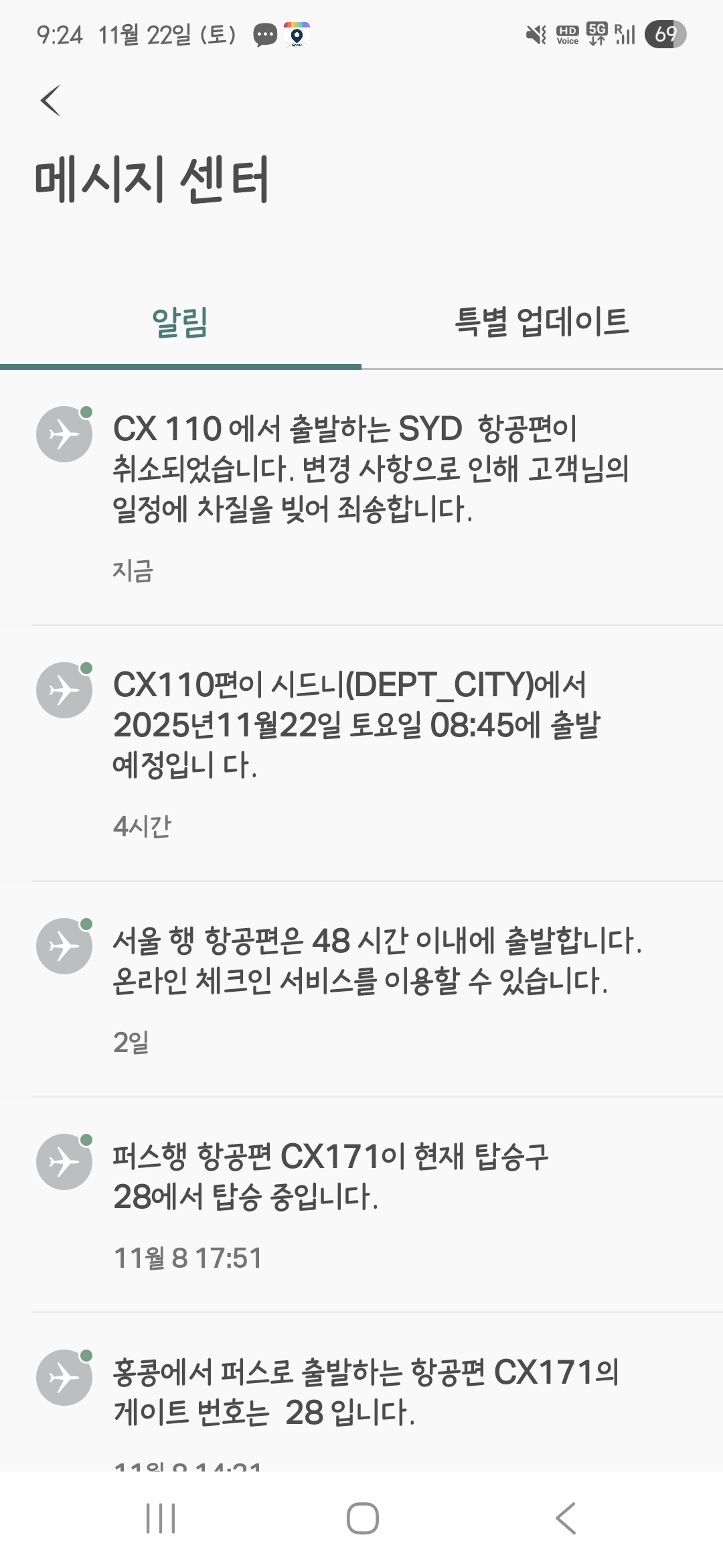 당일 아침에도 CX에서 정상 출발이라는 알림을 받았는데, 탑승이 조금씩 지연되더니 결국 기체결함으로 항공편이 취소되었다.