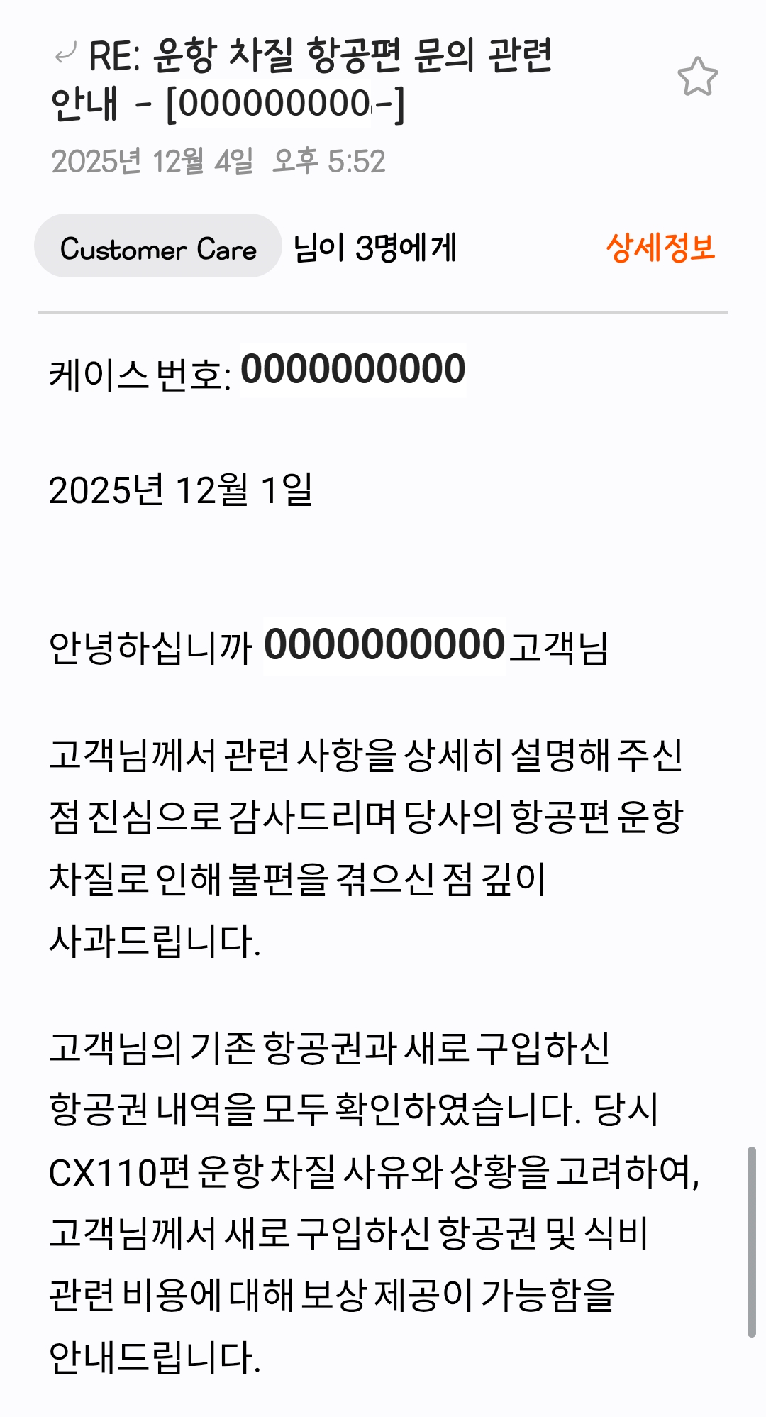도착해서 바로 CX에 보상을 요청하였고, 열흘 후 기내식사 비용까지 포함한 전액을 보상을 해주겠다는 답변을 받았다.