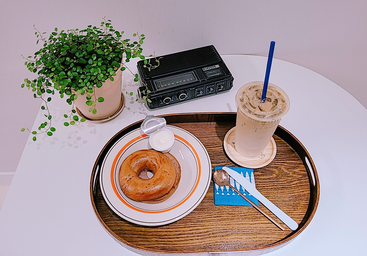 블루베리베이글, 크림치즈, 아이스 카페라테