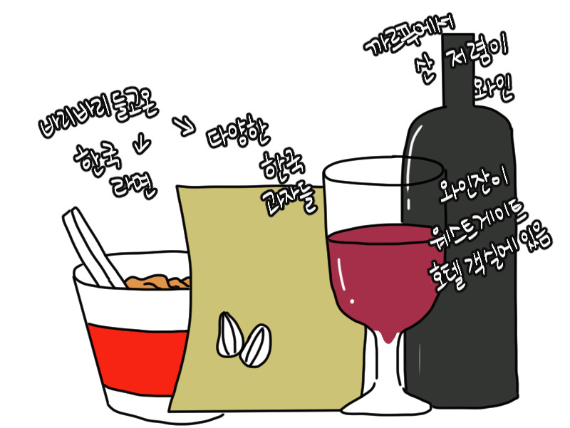 한국에서 바리바리 들고 온 라면과, 과자들을 안주 삼아서 대만 까르푸(마트)에 들려 산 와인들과 함께 시간을 보냈다. 국내에서는 이렇게 여자 7명이 모여 술을 마신 기억이 없다. 대만에서라도 다 같이 술을 마실 수 있고 대화를 나눌 수 있다는 것이 너무 좋았다.